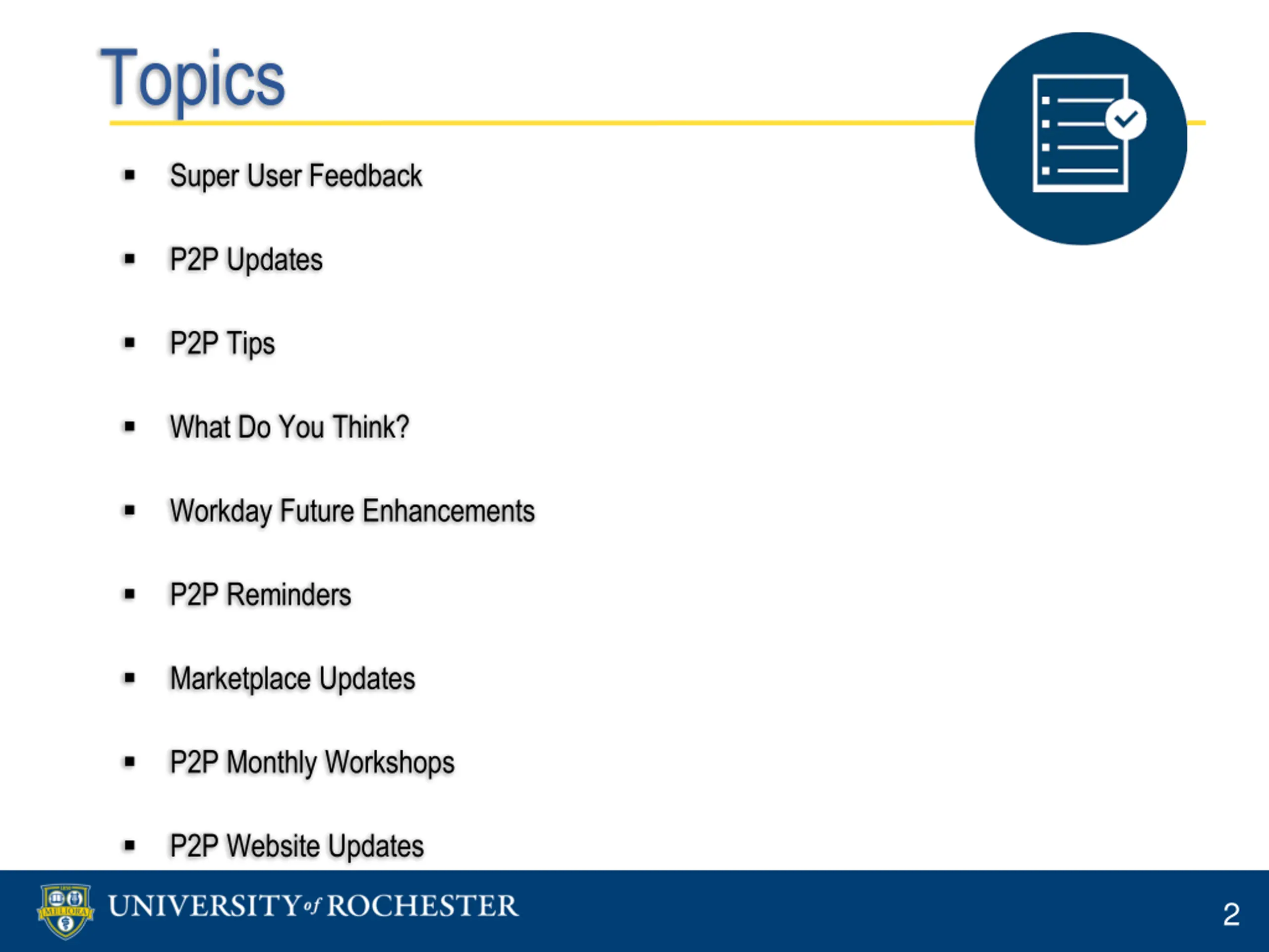 Topics Super User Feedback P2P Updates P2P Tips What Do You Think? Workday Future Enhancements P2P Reminders Marketplace Updates P2P Monthly Workshops P2P Website Updates 2