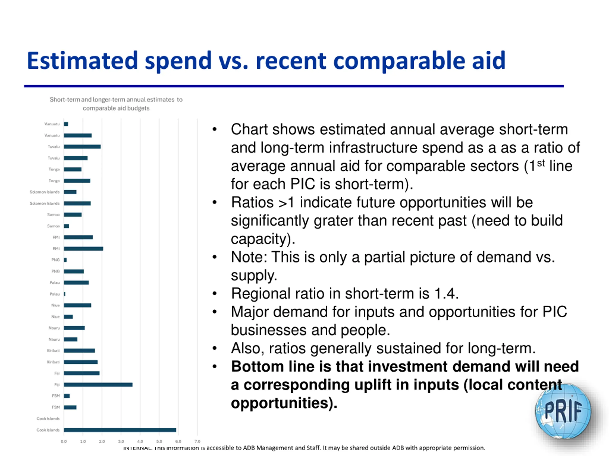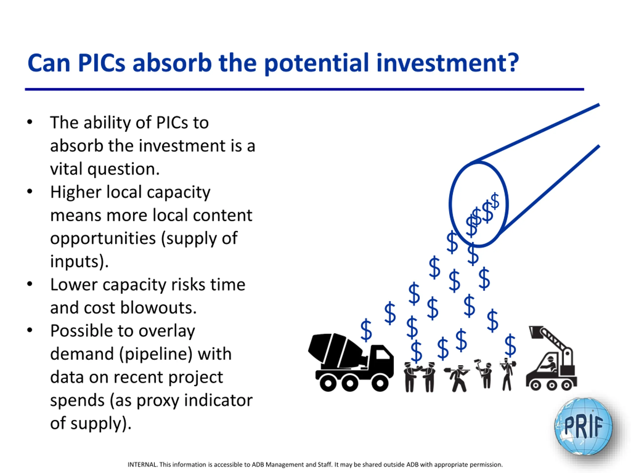 Can PICs absorb the potential investment? The ability of PICs to absorb the investment is a vital question. Higher local capacity means more local content opportunities (supply of inputs). Lower capacity risks time and cost blowouts. Possible to overlay demand (pipeline) with data on recent project spends (as proxy indicator of supply). INTERNAL. This information is accessible to ADB Management and Staff. It may be shared outside ADB with appropriate permission.