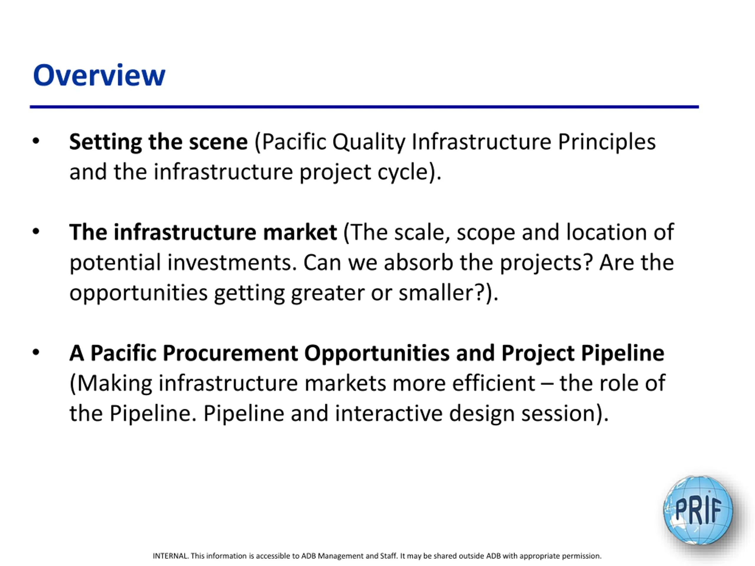 Overview Setting the scene (Pacific Quality Infrastructure Principles and the infrastructure project cycle). The infrastructure market (The scale, scope and location of potential investments. Can we absorb the projects? Are the opportunities getting greater or smaller?). A Pacific Procurement Opportunities and Project Pipeline (Making infrastructure markets more efficient the role of the Pipeline. Pipeline and interactive design session). INTERNAL. This information is accessible to ADB Management and Staff. It may be shared outside ADB with appropriate permission.