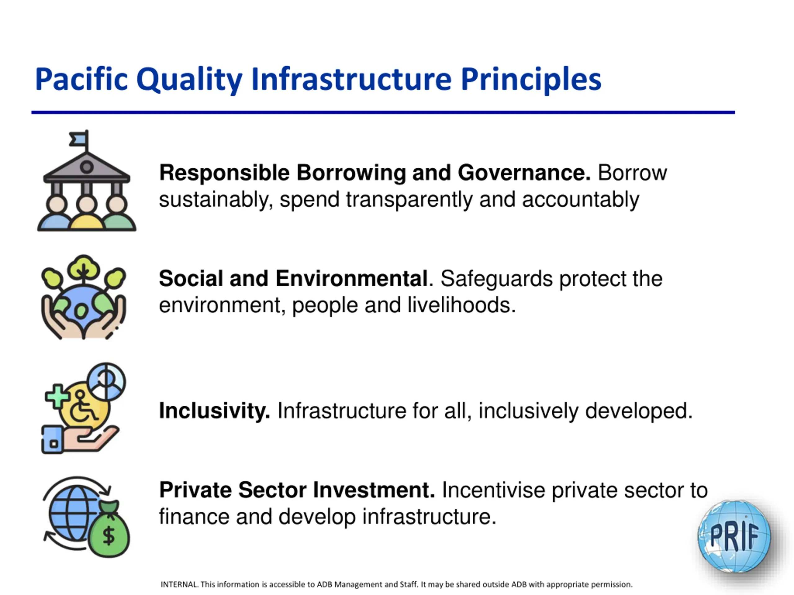 Pacific Quality Infrastructure Principles Responsible Borrowing and Governance. Borrow sustainably, spend transparently and accountably Social and Environmental. Safeguards protect the environment, people and livelihoods. Inclusivity. Infrastructure for all, inclusively developed. Private Sector Investment. Incentivise private sector to finance and develop infrastructure. INTERNAL. This information is accessible to ADB Management and Staff. It may be shared outside ADB with appropriate permission.