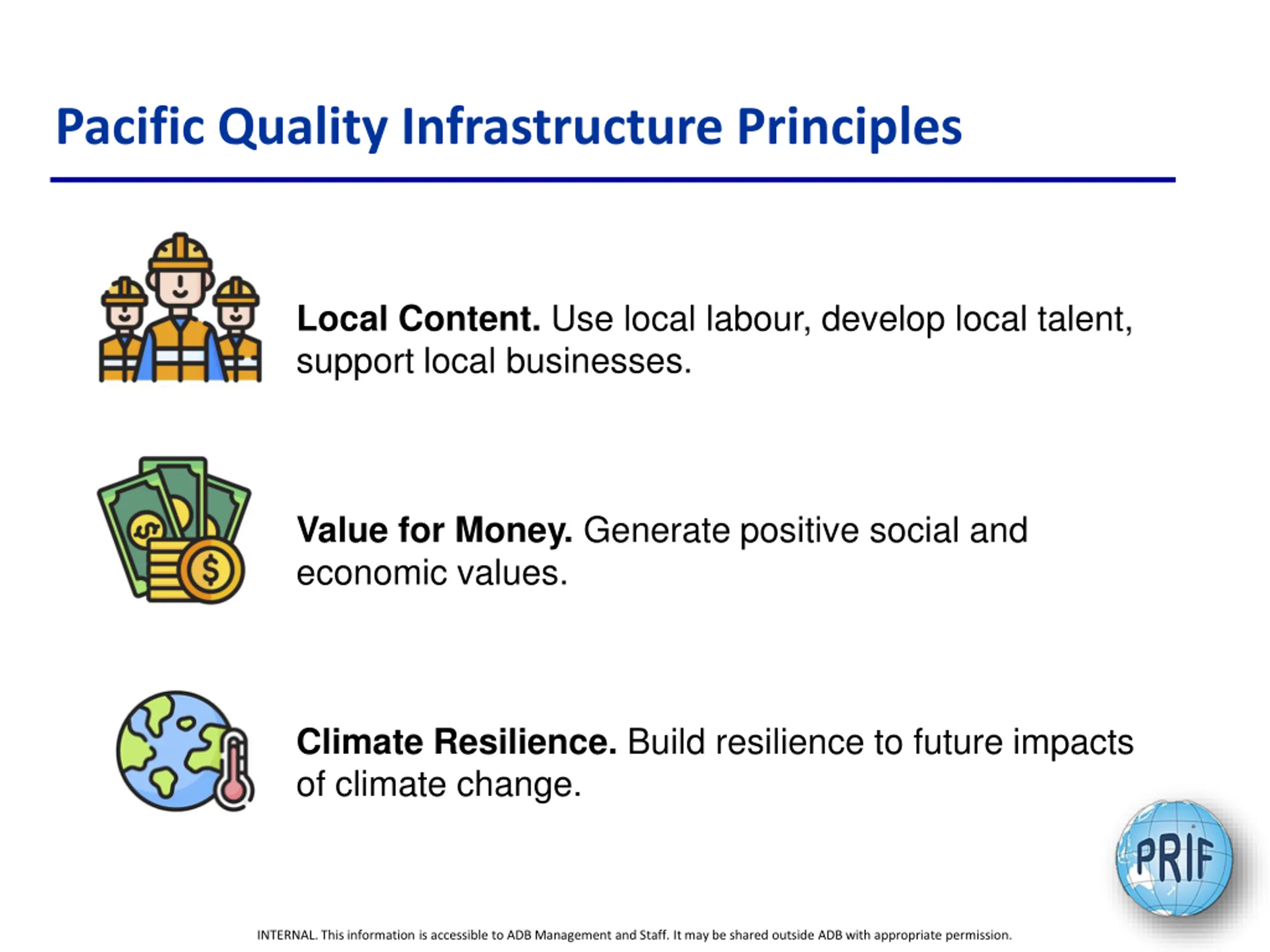 Pacific Quality Infrastructure Principles Local Content. Use local labour, develop local talent, support local businesses. Value for Money. Generate positive social and economic values. Climate Resilience. Build resilience to future impacts of climate change. INTERNAL. This information is accessible to ADB Management and Staff. It may be shared outside ADB with appropriate permission.