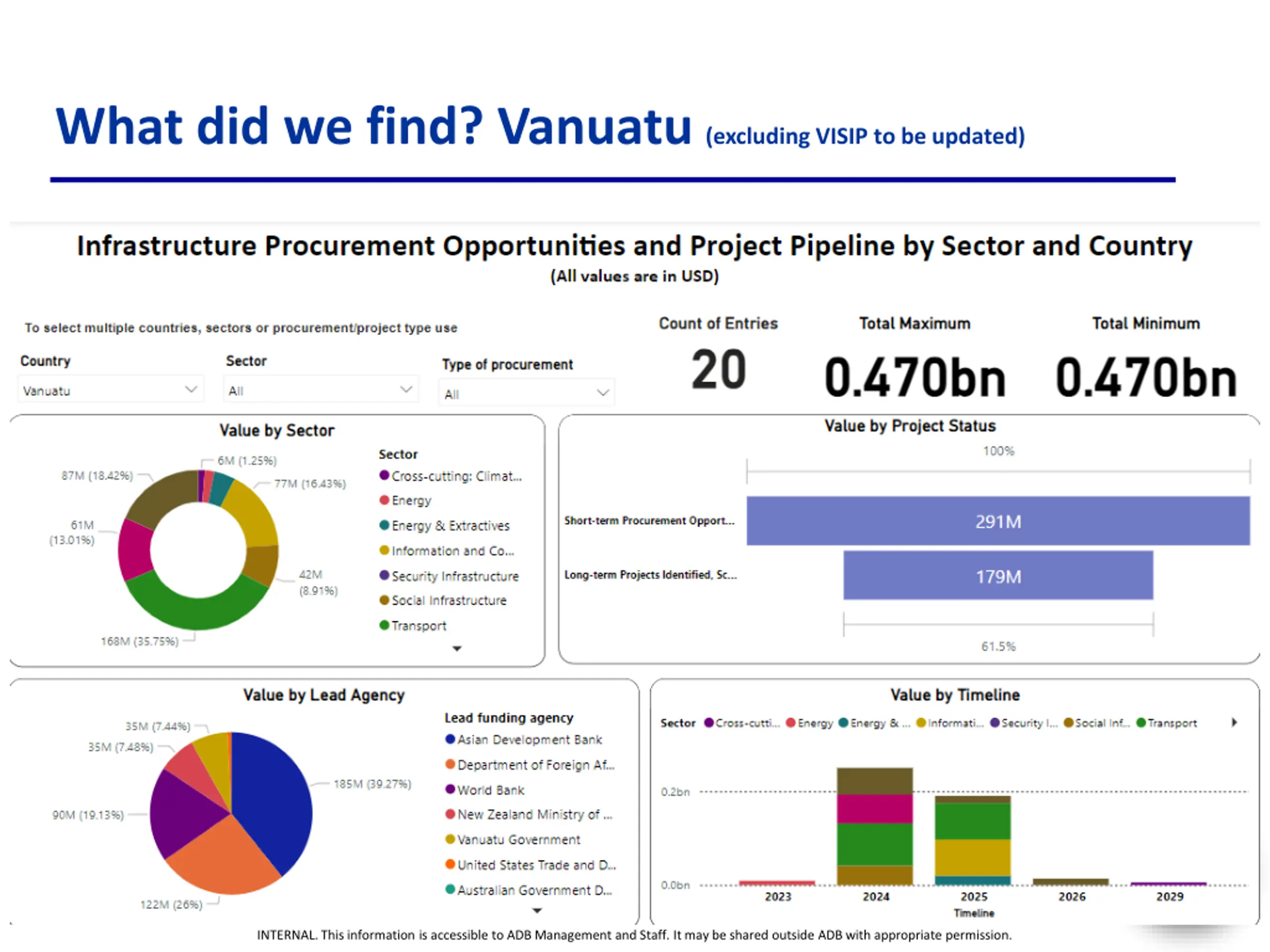 What did we find? Vanuatu (excluding VISIP to be updated) INTERNAL. This information is accessible to ADB Management and Staff. It may be shared outside ADB with appropriate permission.