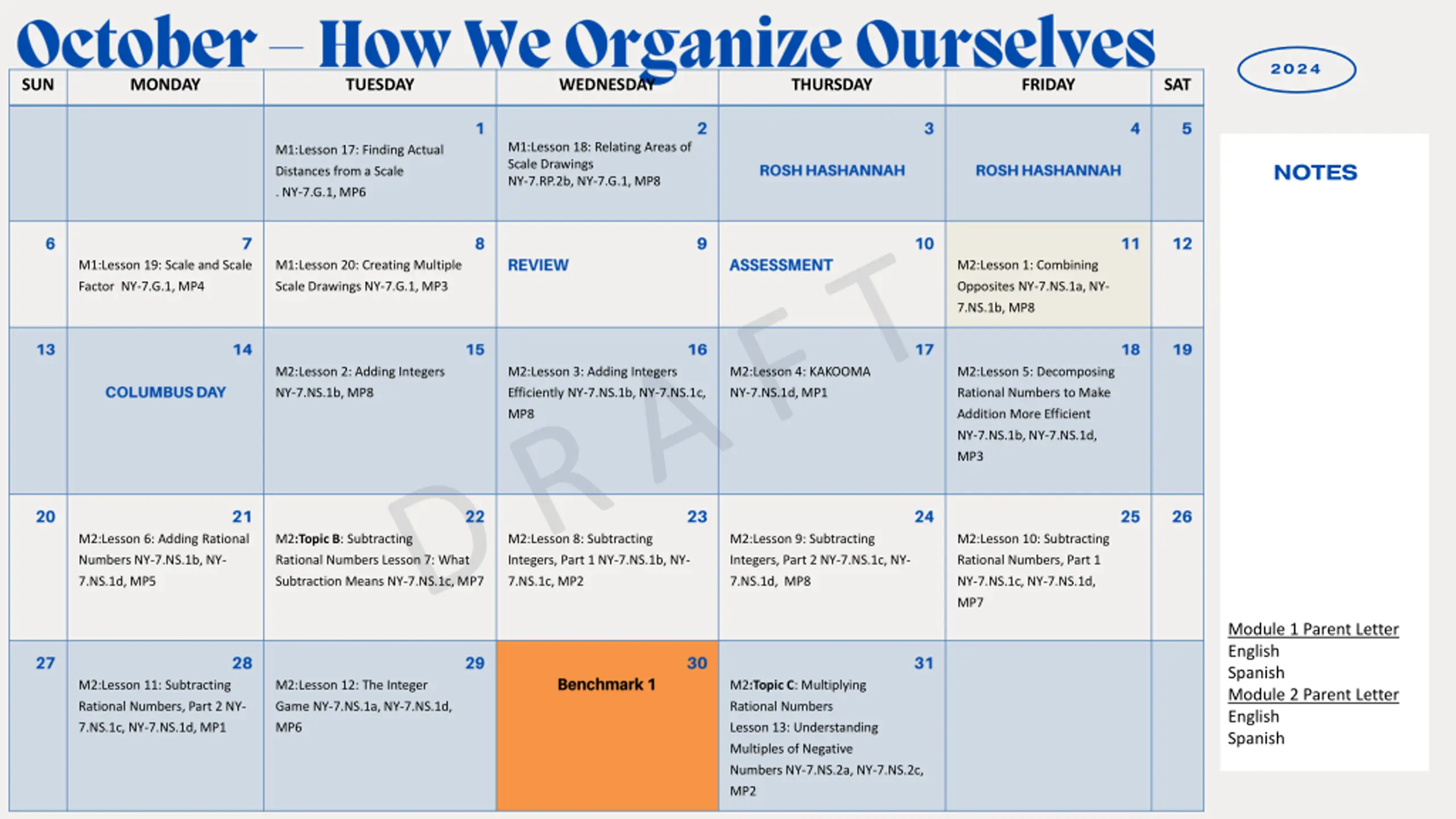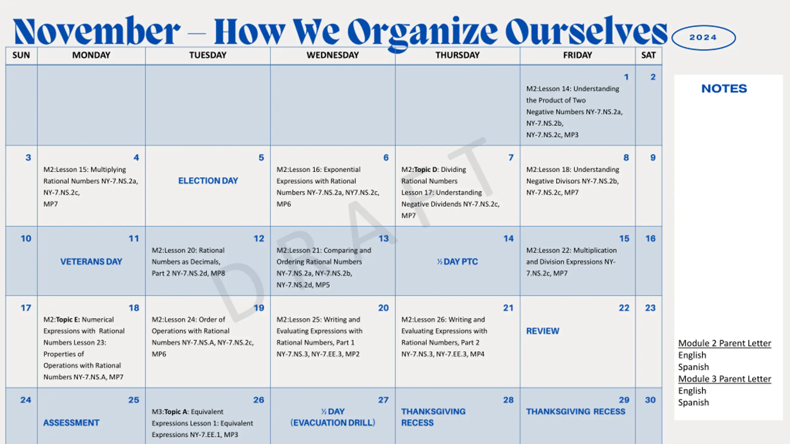 2 0 2 4 SUN MONDAY TUESDAY WEDNESDAY THURSDAY FRIDAY SAT NOTES M2:Lesson 14: Understanding the Product of Two Negative Numbers NY-7.NS.2a, NY-7.NS.2b, NY-7.NS.2c, MP3 M2:Lesson 15: Multiplying Rational Numbers NY-7.NS.2a, NY-7.NS.2c, MP7 M2:Lesson 16: Exponential Expressions with Rational Numbers NY-7.NS.2a, NY7.NS.2c, MP6 M2:Topic D: Dividing Rational Numbers Lesson 17: Understanding Negative Dividends NY-7.NS.2c, MP7 M2:Lesson 18: Understanding Negative Divisors NY-7.NS.2b, NY-7.NS.2c, MP7 M2:Lesson 20: Rational Numbers as Decimals, Part 2 NY-7.NS.2d, MP8 M2:Lesson 21: Comparing and Ordering Rational Numbers NY-7.NS.2a, NY-7.NS.2b, NY-7.NS.2d, MP5 M2:Lesson 22: Multiplication and Division Expressions NY- 7.NS.2c, MP7 M2:Topic E: Numerical Expressions with Rational Numbers Lesson 23: Properties of Operations with Rational Numbers NY-7.NS.A, MP7 M2:Lesson 24: Order of Operations with Rational Numbers NY-7.NS.A, NY-7.NS.2c, MP6 M2:Lesson 25: Writing and Evaluating Expressions with Rational Numbers, Part 1 NY-7.NS.3, NY-7.EE.3, MP2 M2:Lesson 26: Writing and Evaluating Expressions with Rational Numbers, Part 2 NY-7.NS.3, NY-7.EE.3, MP4 Module 2 Parent Letter English Spanish Module 3 Parent Letter English Spanish M3:Topic A: Equivalent Expressions Lesson 1: Equivalent Expressions NY-7.EE.1, MP3
