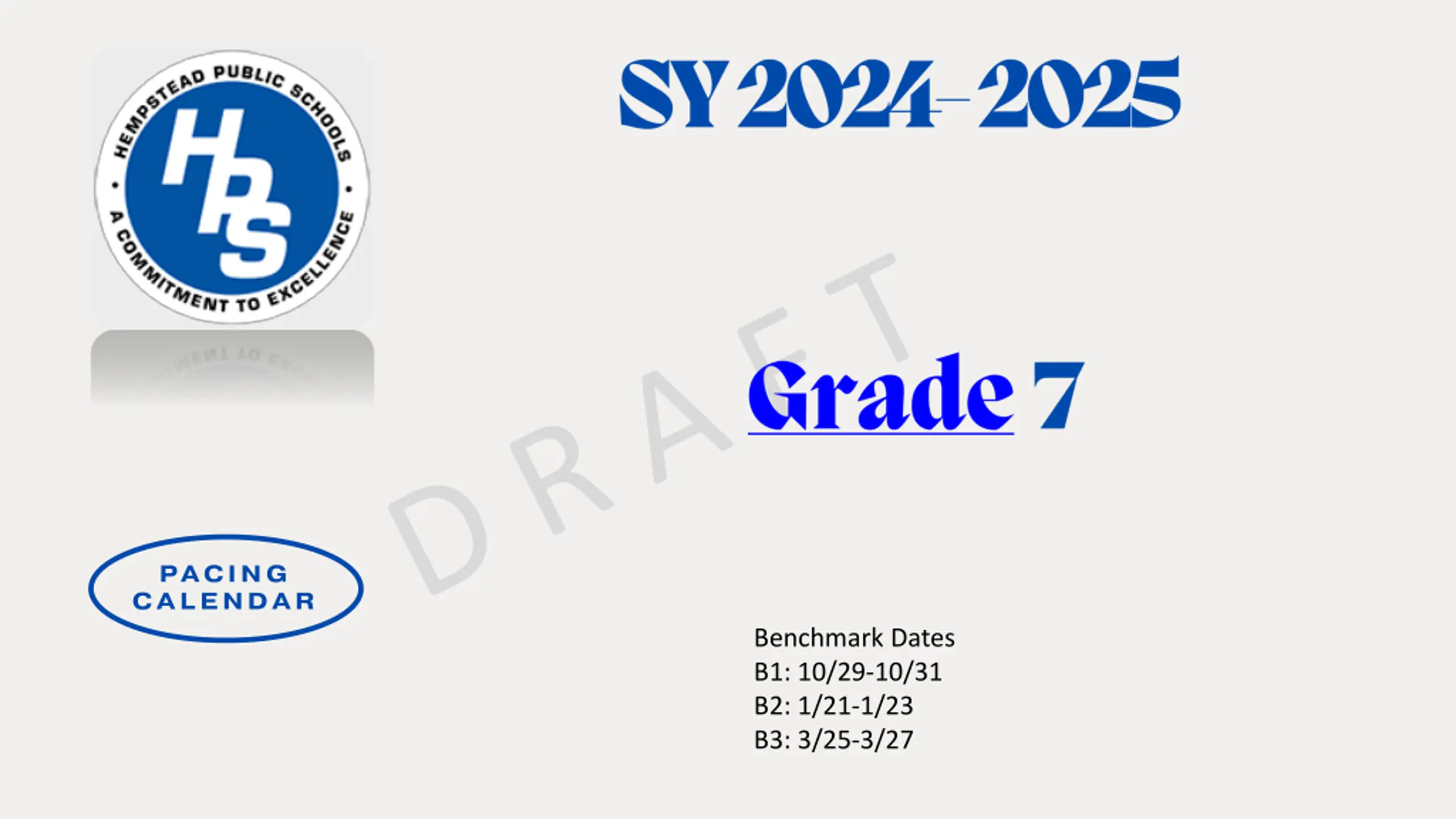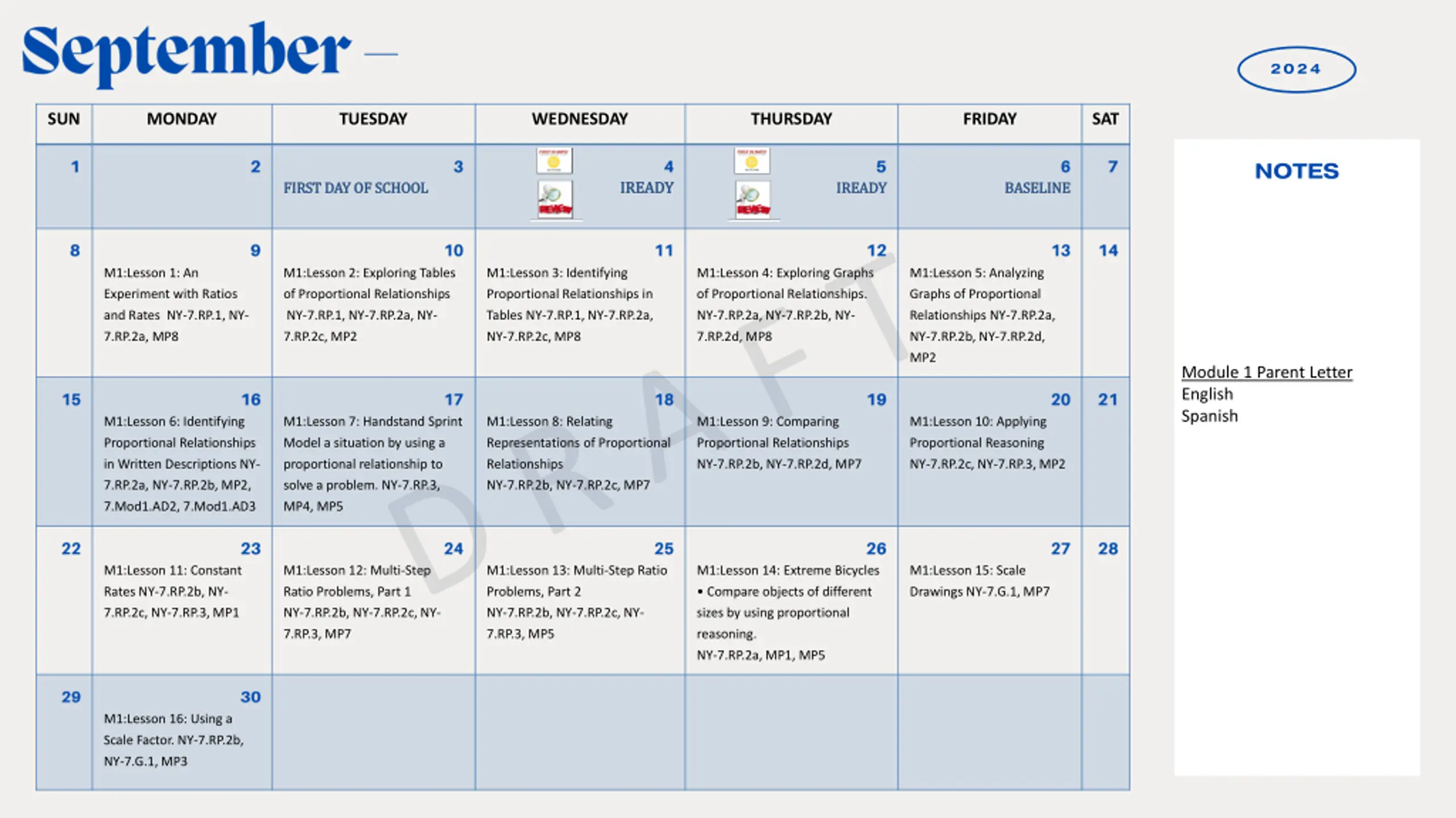 2 0 2 4 SUN MONDAY TUESDAY WEDNESDAY THURSDAY FRIDAY SAT NOTES IREADY IREADY FIRST DAY OF SCHOOL FIRST DAY OF SCHOOL IREADY IREADY BASELINE BASELINE M1:Lesson 1: An Experiment with Ratios and Rates NY-7.RP.1, NY- 7.RP.2a, MP8 M1:Lesson 2: Exploring Tables of Proportional Relationships NY-7.RP.1, NY-7.RP.2a, NY- 7.RP.2c, MP2 M1:Lesson 3: Identifying Proportional Relationships in Tables NY-7.RP.1, NY-7.RP.2a, NY-7.RP.2c, MP8 M1:Lesson 4: Exploring Graphs of Proportional Relationships. NY-7.RP.2a, NY-7.RP.2b, NY- 7.RP.2d, MP8 M1:Lesson 5: Analyzing Graphs of Proportional Relationships NY-7.RP.2a, NY-7.RP.2b, NY-7.RP.2d, MP2 Module 1 Parent Letter English Spanish M1:Lesson 6: Identifying Proportional Relationships in Written Descriptions NY- 7.RP.2a, NY-7.RP.2b, MP2, 7.Mod1.AD2, 7.Mod1.AD3 M1:Lesson 7: Handstand Sprint Model a situation by using a proportional relationship to solve a problem. NY-7.RP.3, MP4, MP5 M1:Lesson 8: Relating Representations of Proportional Relationships NY-7.RP.2b, NY-7.RP.2c, MP7 M1:Lesson 9: Comparing Proportional Relationships NY-7.RP.2b, NY-7.RP.2d, MP7 M1:Lesson 10: Applying Proportional Reasoning NY-7.RP.2c, NY-7.RP.3, MP2 M1:Lesson 11: Constant Rates NY-7.RP.2b, NY- 7.RP.2c, NY-7.RP.3, MP1 M1:Lesson 12: Multi-Step Ratio Problems, Part 1 NY-7.RP.2b, NY-7.RP.2c, NY- 7.RP.3, MP7 M1:Lesson 13: Multi-Step Ratio Problems, Part 2 NY-7.RP.2b, NY-7.RP.2c, NY- 7.RP.3, MP5 M1:Lesson 14: Extreme Bicycles Compare objects of different sizes by using proportional reasoning. NY-7.RP.2a, MP1, MP5 M1:Lesson 15: Scale Drawings NY-7.G.1, MP7 M1:Lesson 16: Using a Scale Factor. NY-7.RP.2b, NY-7.G.1, MP3