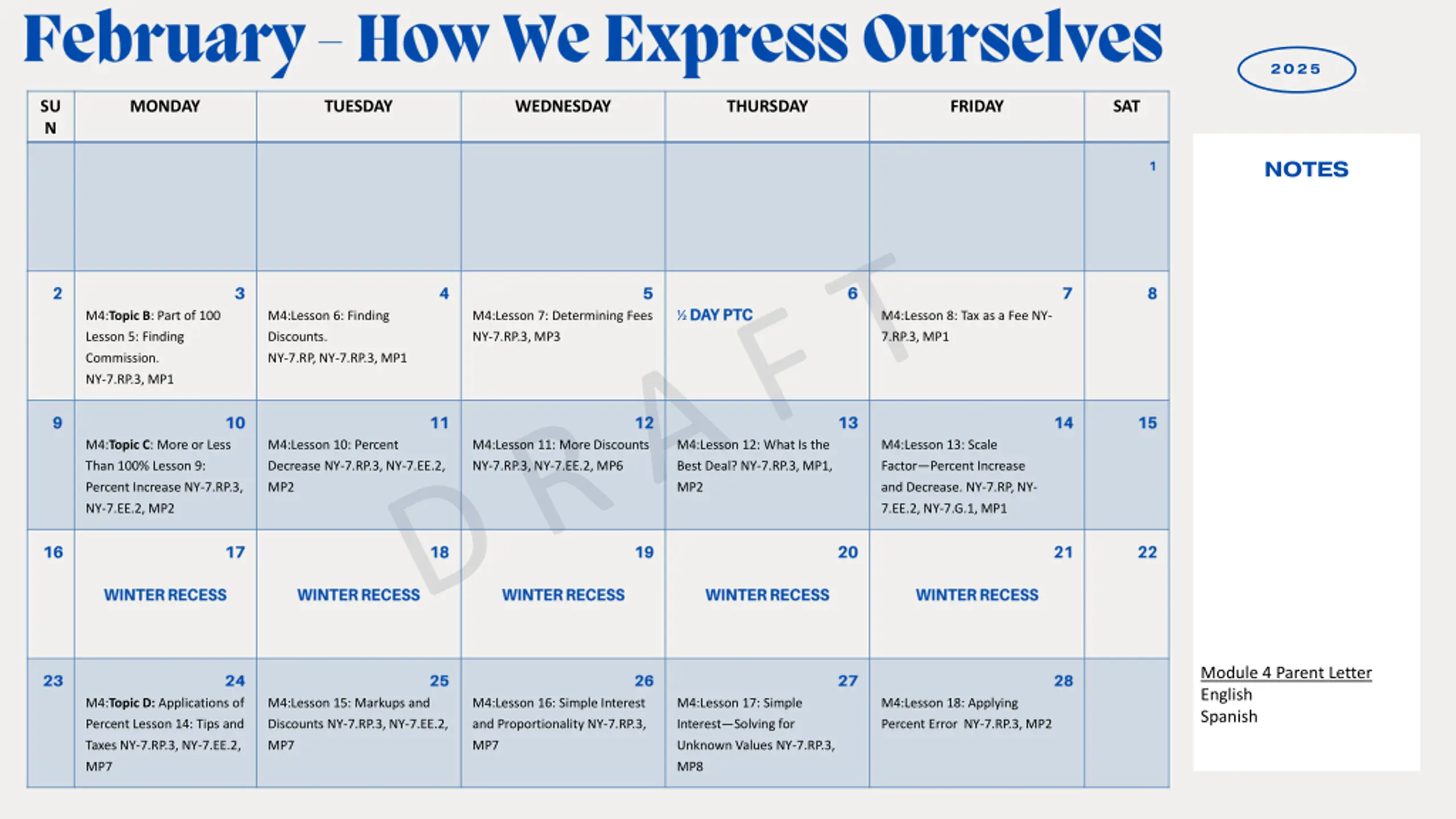 2 0 2 5 SU N MONDAY TUESDAY WEDNESDAY THURSDAY FRIDAY SAT NOTES M4:Topic B: Part of 100 Lesson 5: Finding Commission. NY-7.RP.3, MP1 M4:Lesson 6: Finding Discounts. NY-7.RP, NY-7.RP.3, MP1 M4:Lesson 7: Determining Fees NY-7.RP.3, MP3 M4:Lesson 8: Tax as a Fee NY- 7.RP.3, MP1 M4:Topic C: More or Less Than 100% Lesson 9: Percent Increase NY-7.RP.3, NY-7.EE.2, MP2 M4:Lesson 10: Percent Decrease NY-7.RP.3, NY-7.EE.2, MP2 M4:Lesson 11: More Discounts NY-7.RP.3, NY-7.EE.2, MP6 M4:Lesson 12: What Is the Best Deal? NY-7.RP.3, MP1, MP2 M4:Lesson 13: Scale Factor Percent Increase and Decrease. NY-7.RP, NY- 7.EE.2, NY-7.G.1, MP1 Module 4 Parent Letter English Spanish M4:Topic D: Applications of Percent Lesson 14: Tips and Taxes NY-7.RP.3, NY-7.EE.2, MP7 M4:Lesson 15: Markups and Discounts NY-7.RP.3, NY-7.EE.2, MP7 M4:Lesson 16: Simple Interest and Proportionality NY-7.RP.3, MP7 M4:Lesson 17: Simple Interest Solving for Unknown Values NY-7.RP.3, MP8 M4:Lesson 18: Applying Percent Error NY-7.RP.3, MP2