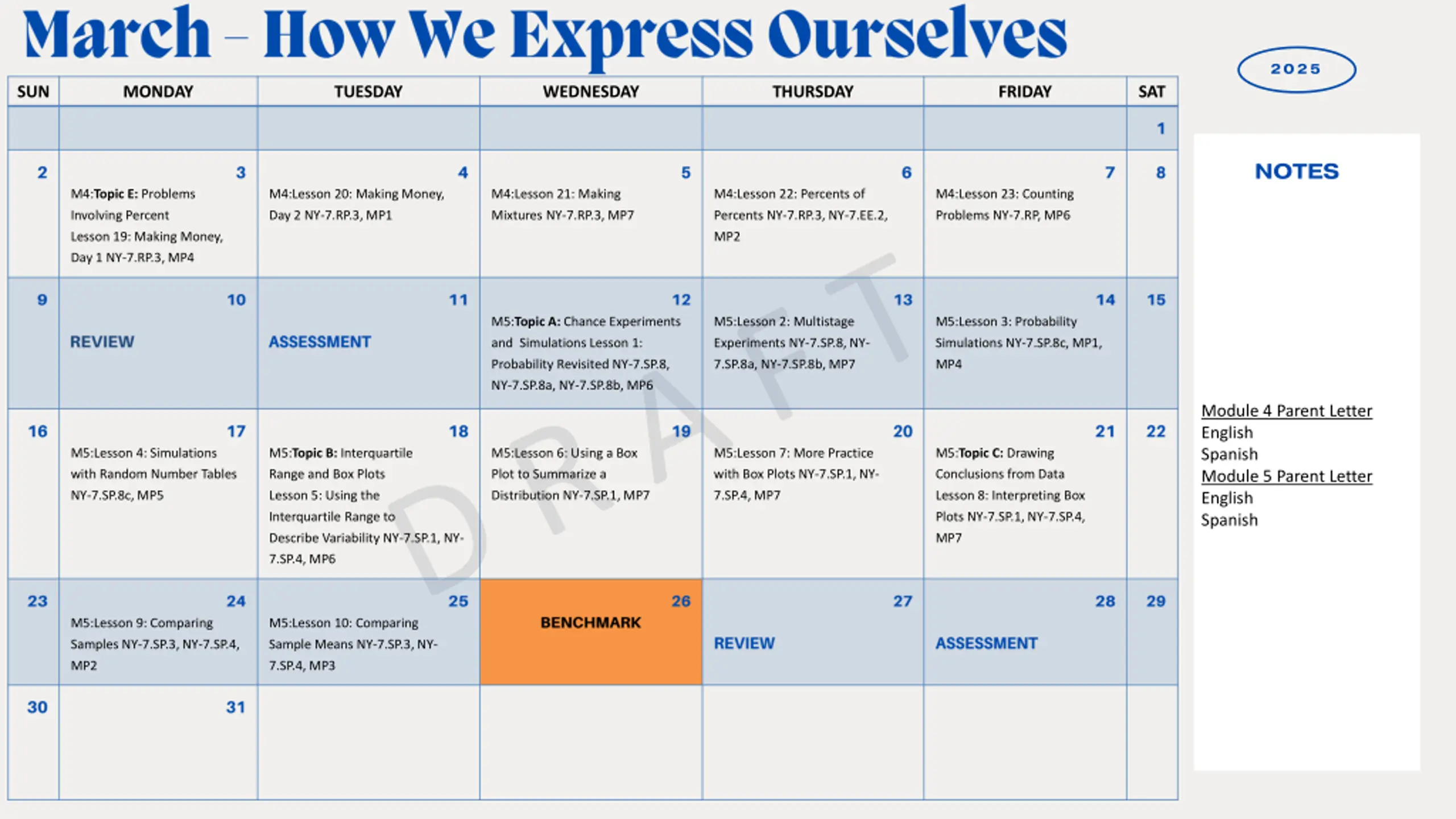 2 0 2 5 SUN MONDAY TUESDAY WEDNESDAY THURSDAY FRIDAY SAT NOTES M4:Topic E: Problems Involving Percent Lesson 19: Making Money, Day 1 NY-7.RP.3, MP4 M4:Lesson 20: Making Money, Day 2 NY-7.RP.3, MP1 M4:Lesson 21: Making Mixtures NY-7.RP.3, MP7 M4:Lesson 22: Percents of Percents NY-7.RP.3, NY-7.EE.2, MP2 M4:Lesson 23: Counting Problems NY-7.RP, MP6 M5:Topic A: Chance Experiments and Simulations Lesson 1: Probability Revisited NY-7.SP.8, NY-7.SP.8a, NY-7.SP.8b, MP6 M5:Lesson 2: Multistage Experiments NY-7.SP.8, NY- 7.SP.8a, NY-7.SP.8b, MP7 M5:Lesson 3: Probability Simulations NY-7.SP.8c, MP1, MP4 Module 4 Parent Letter English Spanish Module 5 Parent Letter English Spanish M5:Lesson 4: Simulations with Random Number Tables NY-7.SP.8c, MP5 M5:Topic B: Interquartile Range and Box Plots Lesson 5: Using the Interquartile Range to Describe Variability NY-7.SP.1, NY- 7.SP.4, MP6 M5:Lesson 6: Using a Box Plot to Summarize a Distribution NY-7.SP.1, MP7 M5:Lesson 7: More Practice with Box Plots NY-7.SP.1, NY- 7.SP.4, MP7 M5:Topic C: Drawing Conclusions from Data Lesson 8: Interpreting Box Plots NY-7.SP.1, NY-7.SP.4, MP7 M5:Lesson 9: Comparing Samples NY-7.SP.3, NY-7.SP.4, MP2 M5:Lesson 10: Comparing Sample Means NY-7.SP.3, NY- 7.SP.4, MP3