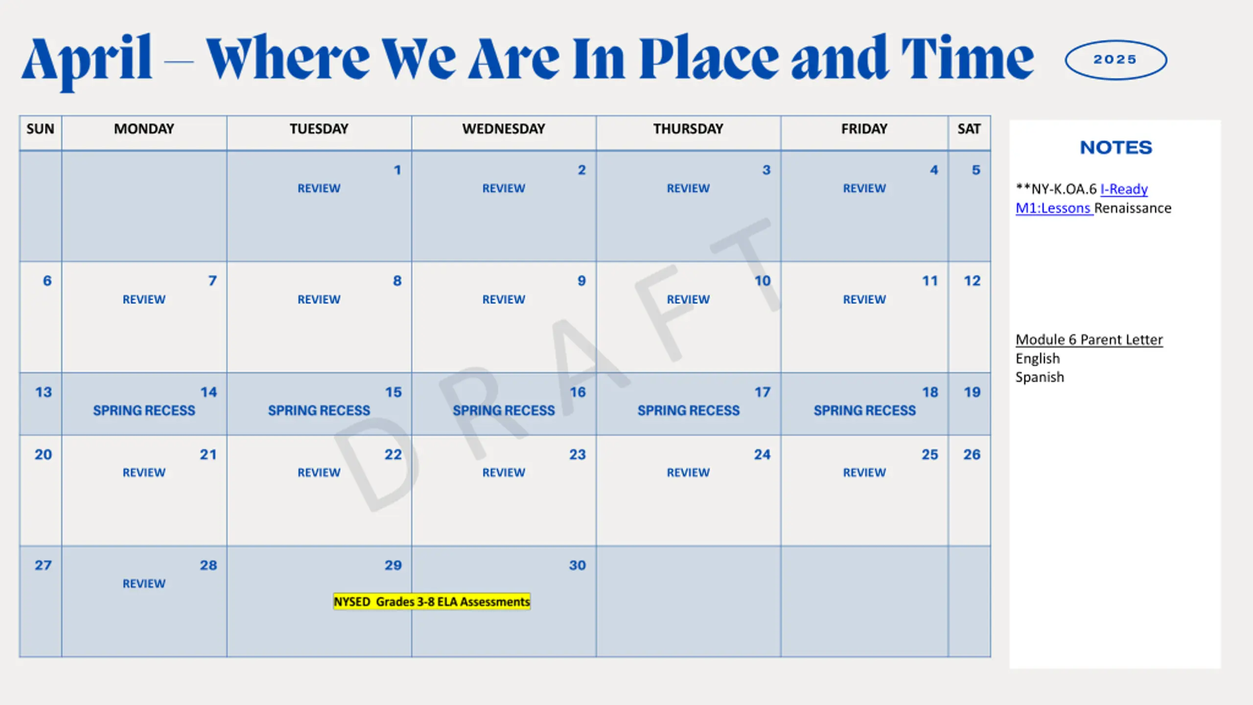 2 0 2 5 SUN MONDAY TUESDAY WEDNESDAY THURSDAY FRIDAY SAT NOTES **NY-K.OA.6 I-Ready M1:Lessons Renaissance REVIEW REVIEW REVIEW REVIEW REVIEW REVIEW REVIEW REVIEW REVIEW Module 6 Parent Letter English Spanish REVIEW REVIEW REVIEW REVIEW REVIEW REVIEW