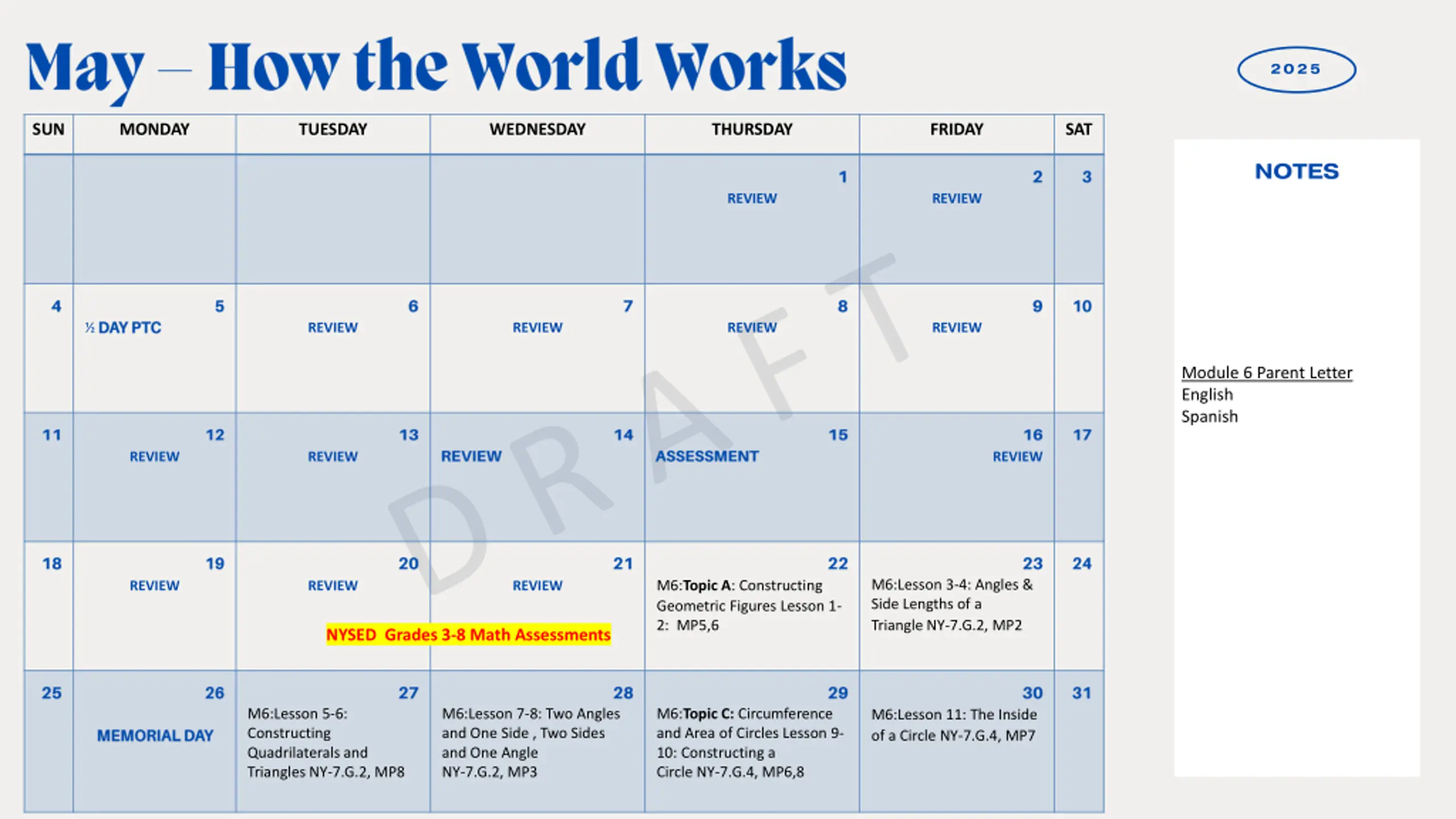 2 0 2 5 SUN MONDAY TUESDAY WEDNESDAY THURSDAY FRIDAY SAT NOTES REVIEW REVIEW REVIEW REVIEW REVIEW REVIEW Module 6 Parent Letter English Spanish REVIEW REVIEW REVIEW M6:Lesson 3-4: Angles & Side Lengths of a Triangle NY-7.G.2, MP2 M6:Topic A: Constructing Geometric Figures Lesson 1- 2: MP5,6 REVIEW REVIEW REVIEW NYSED Grades 3-8 Math Assessments M6:Lesson 5-6: Constructing Quadrilaterals and Triangles NY-7.G.2, MP8 M6:Lesson 7-8: Two Angles and One Side , Two Sides and One Angle NY-7.G.2, MP3 M6:Topic C: Circumference and Area of Circles Lesson 9- 10: Constructing a Circle NY-7.G.4, MP6,8 M6:Lesson 11: The Inside of a Circle NY-7.G.4, MP7