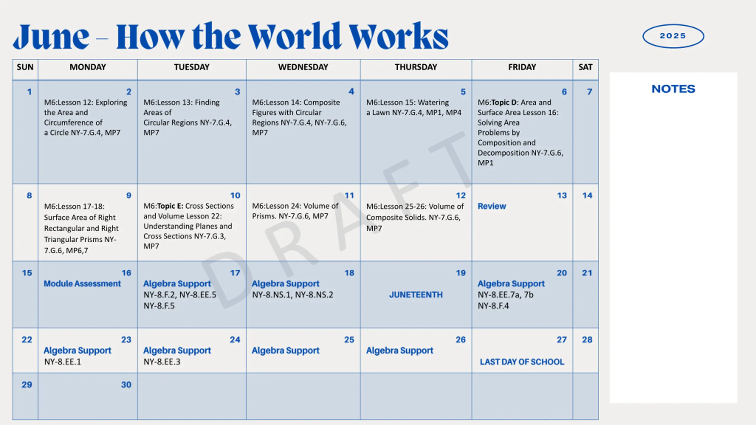 2 0 2 5 SUN MONDAY TUESDAY WEDNESDAY THURSDAY FRIDAY SAT NOTES M6:Lesson 12: Exploring the Area and Circumference of a Circle NY-7.G.4, MP7 M6:Lesson 13: Finding Areas of Circular Regions NY-7.G.4, MP7 M6:Lesson 14: Composite Figures with Circular Regions NY-7.G.4, NY-7.G.6, MP7 M6:Lesson 15: Watering a Lawn NY-7.G.4, MP1, MP4 M6:Topic D: Area and Surface Area Lesson 16: Solving Area Problems by Composition and Decomposition NY-7.G.6, MP1 M6:Topic E: Cross Sections and Volume Lesson 22: Understanding Planes and Cross Sections NY-7.G.3, MP7 M6:Lesson 24: Volume of Prisms. NY-7.G.6, MP7 M6:Lesson 17-18: Surface Area of Right Rectangular and Right Triangular Prisms NY- 7.G.6, MP6,7 M6:Lesson 25-26: Volume of Composite Solids. NY-7.G.6, MP7 NY-8.F.2, NY-8.EE.5 NY-8.F.5 NY-8.NS.1, NY-8.NS.2 NY-8.EE.7a, 7b NY-8.F.4 NY-8.EE.1 NY-8.EE.3
