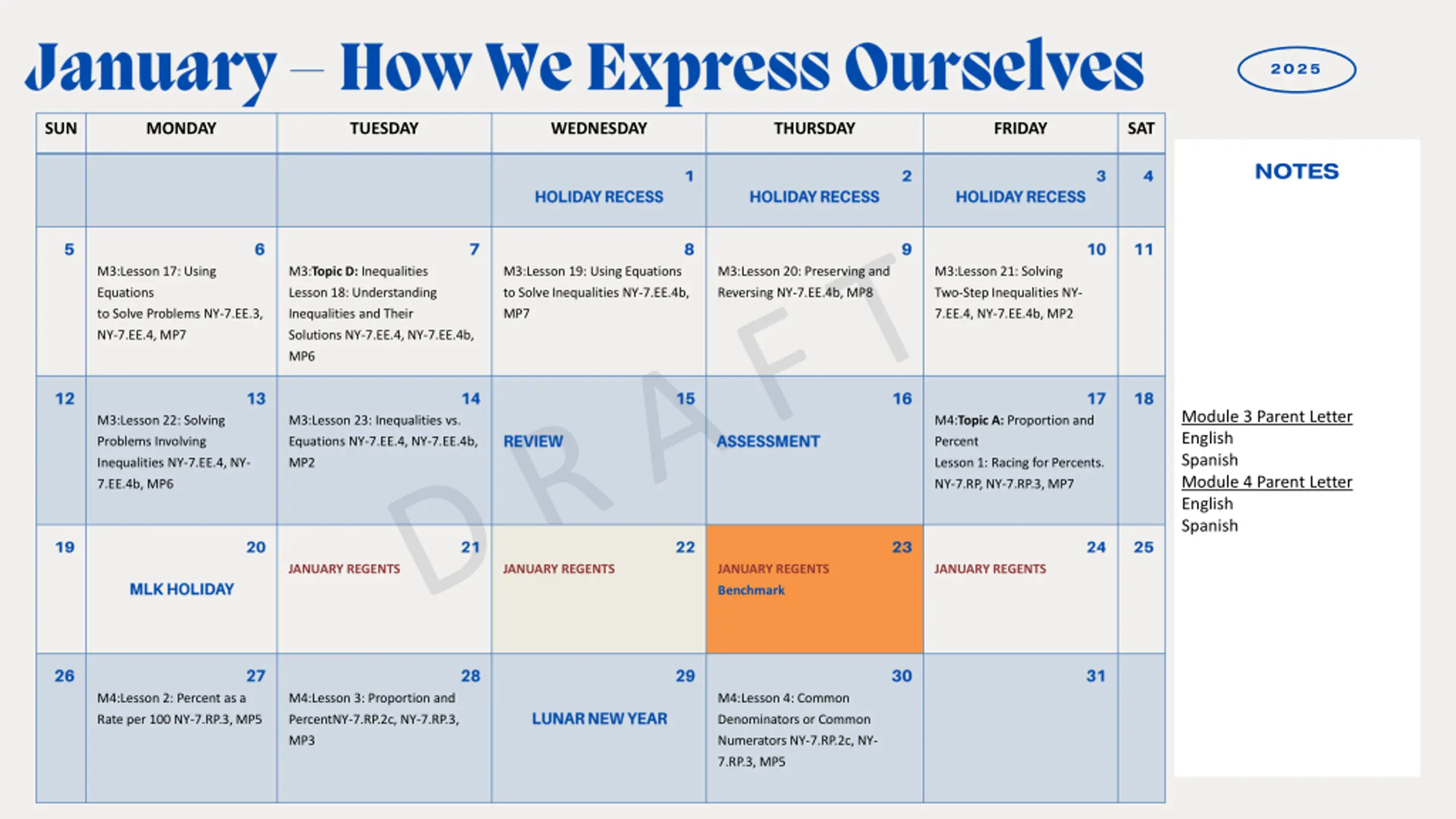 2 0 2 5 SUN MONDAY TUESDAY WEDNESDAY THURSDAY FRIDAY SAT NOTES M3:Lesson 17: Using Equations to Solve Problems NY-7.EE.3, NY-7.EE.4, MP7 M3:Topic D: Inequalities Lesson 18: Understanding Inequalities and Their Solutions NY-7.EE.4, NY-7.EE.4b, MP6 M3:Lesson 19: Using Equations to Solve Inequalities NY-7.EE.4b, MP7 M3:Lesson 20: Preserving and Reversing NY-7.EE.4b, MP8 M3:Lesson 21: Solving Two-Step Inequalities NY- 7.EE.4, NY-7.EE.4b, MP2 Module 3 Parent Letter English Spanish Module 4 Parent Letter English Spanish M3:Lesson 22: Solving Problems Involving Inequalities NY-7.EE.4, NY- 7.EE.4b, MP6 M3:Lesson 23: Inequalities vs. Equations NY-7.EE.4, NY-7.EE.4b, MP2 M4:Topic A: Proportion and Percent Lesson 1: Racing for Percents. NY-7.RP, NY-7.RP.3, MP7 JANUARY REGENTS JANUARY REGENTS JANUARY REGENTS Benchmark JANUARY REGENTS M4:Lesson 2: Percent as a Rate per 100 NY-7.RP.3, MP5 M4:Lesson 3: Proportion and PercentNY-7.RP.2c, NY-7.RP.3, MP3 M4:Lesson 4: Common Denominators or Common Numerators NY-7.RP.2c, NY- 7.RP.3, MP5