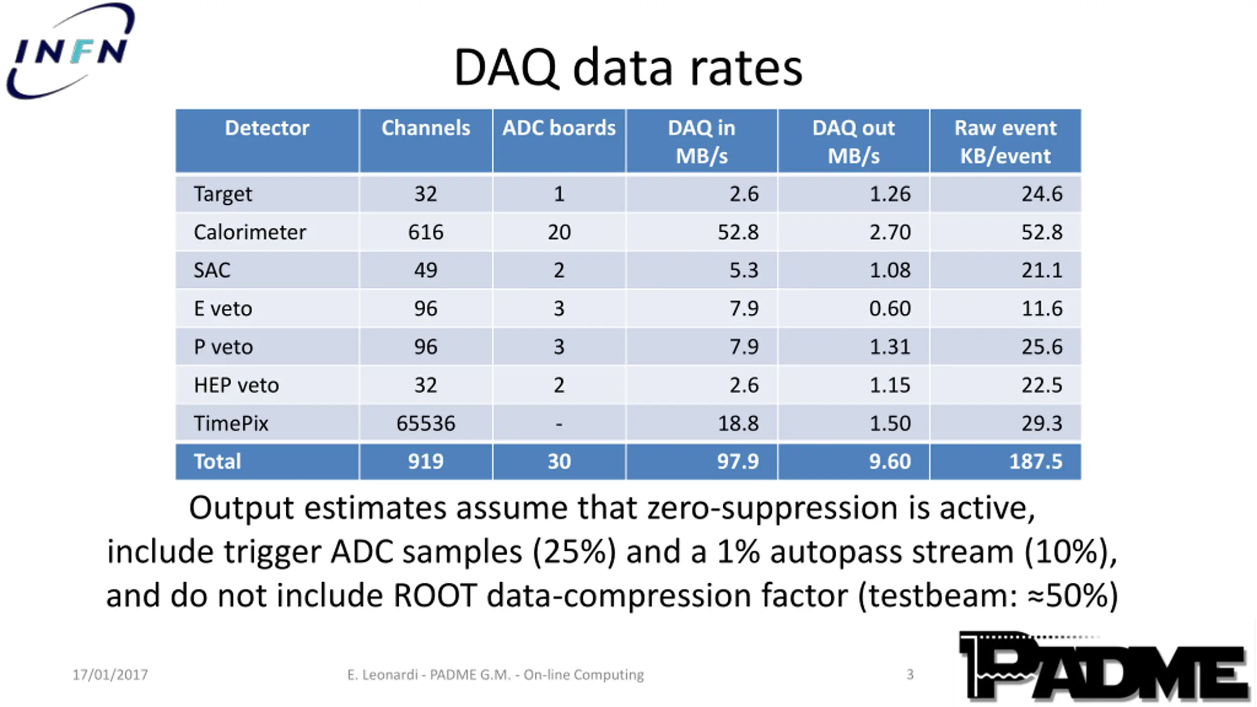DAQ data rates Detector Channels ADC boards DAQ in MB/s DAQ out MB/s Raw event KB/event Target 32 1 2.6 1.26 24.6 Calorimeter 616 20 52.8 2.70 52.8 SAC 49 2 5.3 1.08 21.1 E veto 96 3 7.9 0.60 11.6 P veto 96 3 7.9 1.31 25.6 HEP veto 32 2 2.6 1.15 22.5 TimePix 65536 - 18.8 1.50 29.3 Total Output estimates assume that zero-suppression is active, include trigger ADC samples (25%) and a 1% autopass stream (10%), and do not include ROOT data-compression factor (testbeam: 50%) 919 30 97.9 9.60 187.5 3 17/01/2017 E. Leonardi - PADME G.M. - On-line Computing