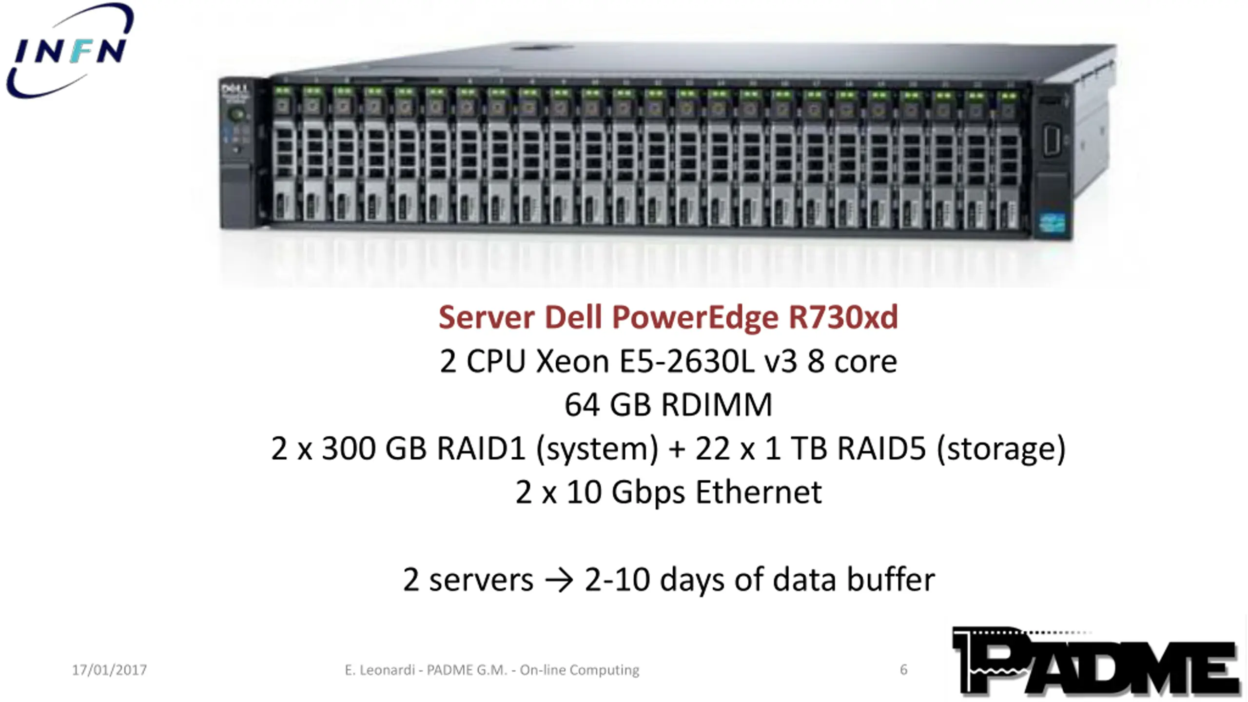 L0 DAQ system Data acquisition + Zero suppression (?) 2 DAQ servers directly connected to ADC boards Each server will mount 2 CAEN A3818 optical boards CAEN will provide 4 A3818 with the ADC boards Current server: HP Proliant DL560 gen 8 (2015) Now available from CONSIP: HP Proliant DL560 gen 9 Possible alternative: DELL PowerEdge R630 Cheaper (-30%) but less performant/expandable 4 17/01/2017 E. Leonardi - PADME G.M. - On-line Computing