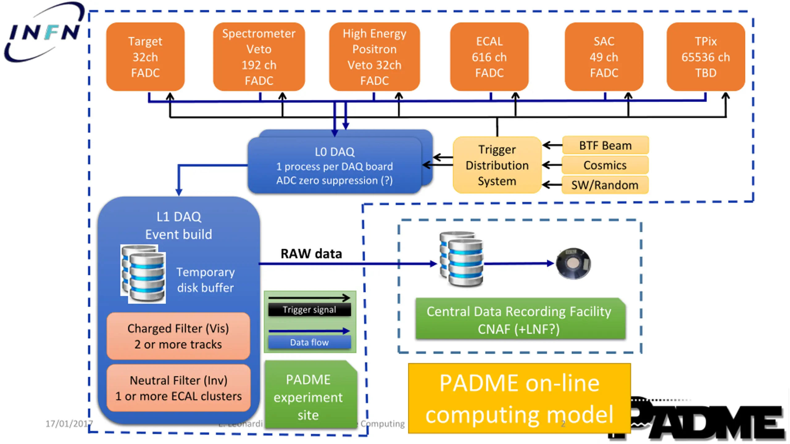 Spectrometer Veto 192 ch FADC High Energy Positron Veto 32ch FADC Target 32ch FADC ECAL 616 ch FADC SAC 49 ch FADC TPix 65536 ch TBD BTF Beam Trigger Distribution System L1 DAQ L0 DAQ Cosmics 1 process per DAQ board 1 process per DAQ board ADC zero suppression (?) SW/Random L1 DAQ Event build RAW data Temporary disk buffer Central Data Recording Facility CNAF (+LNF?) Trigger signal Charged Filter (Vis) 2 or more tracks Data flow PADME on-line computing model PADME experiment Neutral Filter (Inv) 1 or more ECAL clusters E. Leonardi - PADME G.M. - On-line Computing site 2 17/01/2017 2