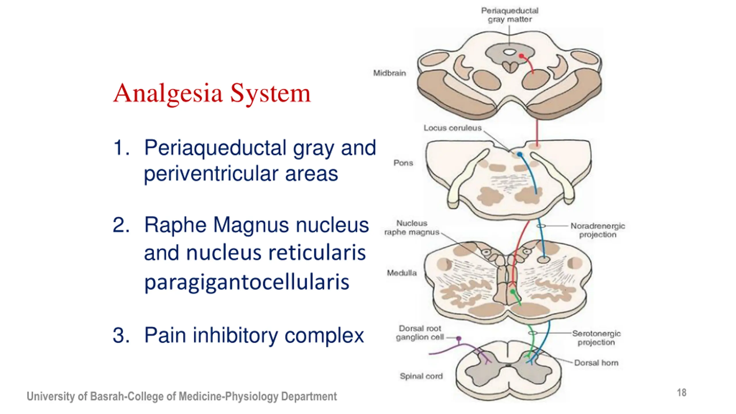 Analgesia System 1. Periaqueductal gray and periventricular areas 2. Raphe Magnus nucleus and nucleus reticularis paragigantocellularis 3. Pain inhibitory complex 18 University of Basrah-College of Medicine-Physiology Department