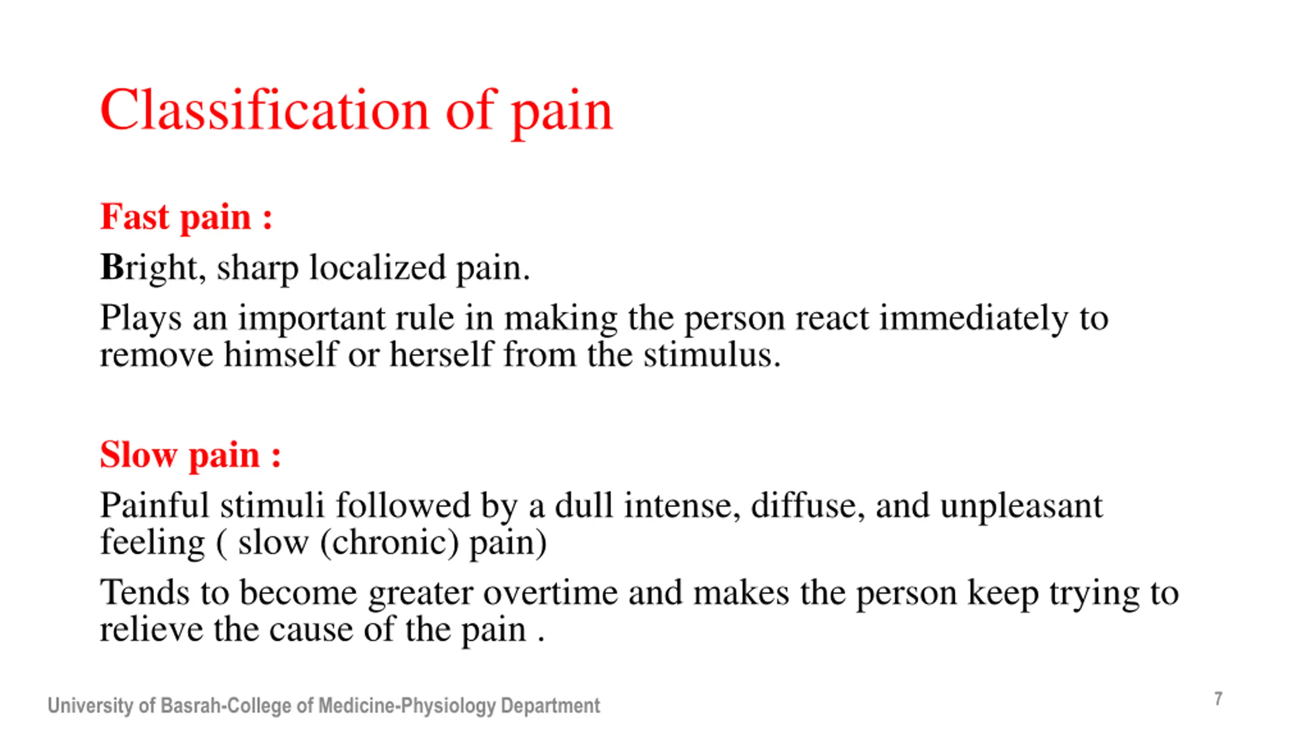Objectives 1. What is pain? 2. Types of painful stimuli. 3. Pain receptors 4. Nerve fibers that transmit pain signals. 5. Classification of pain 6. Pain analgesia system University of Basrah-College of Medicine-Physiology Department 1