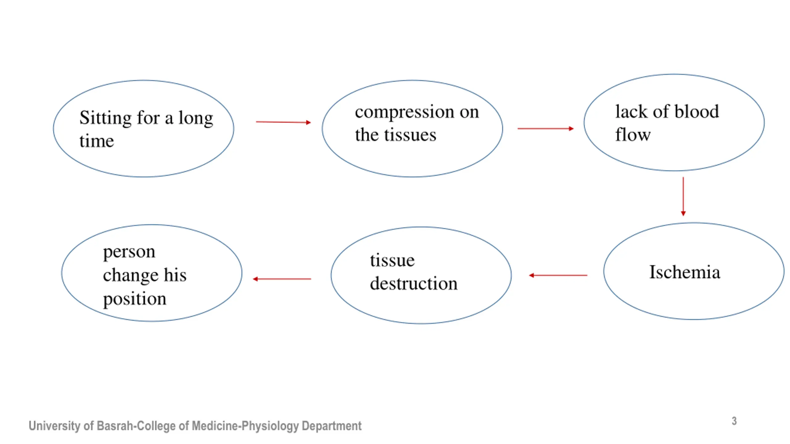 compression on the tissues lack of blood flow Sitting for a long time person change his position tissue destruction Ischemia 3 University of Basrah-College of Medicine-Physiology Department