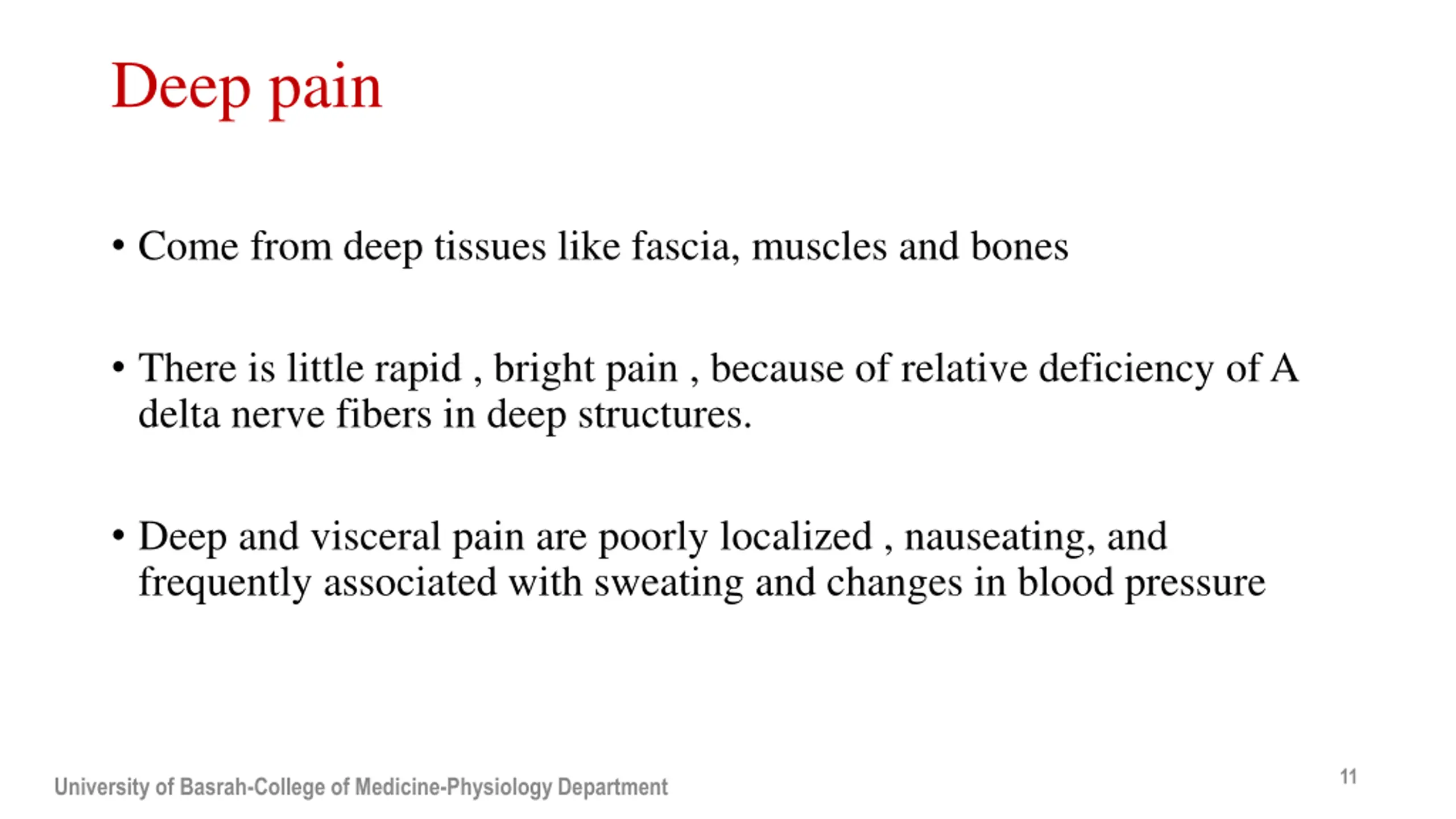 Deep pain Come from deep tissues like fascia, muscles and bones There is little rapid , bright pain , because of relative deficiency of A delta nerve fibers in deep structures. Deep and visceral pain are poorly localized , nauseating, and frequently associated with sweating and changes in blood pressure 11 University of Basrah-College of Medicine-Physiology Department
