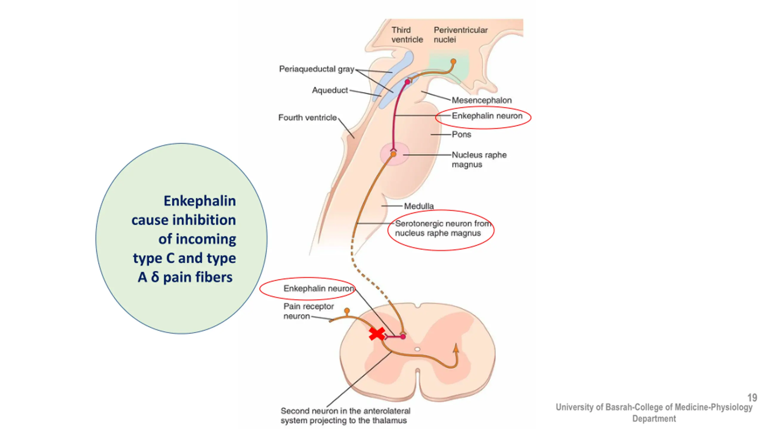 Enkephalin cause inhibition of incoming type C and type A pain fibers 19 University of Basrah-College of Medicine-Physiology Department