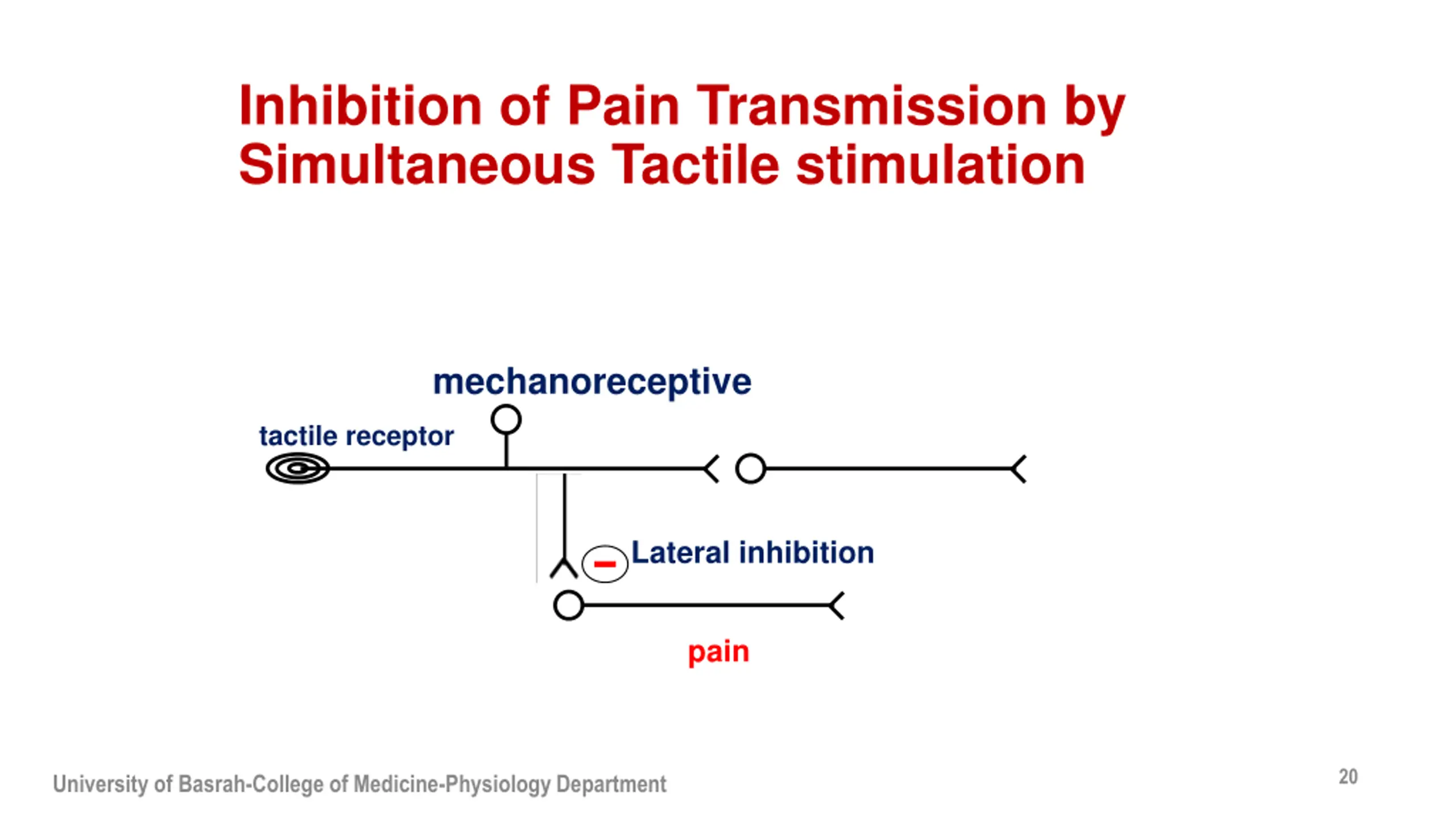 Inhibition of Pain Transmission by Simultaneous Tactile stimulation mechanoreceptive tactile receptor Lateral inhibition pain 20 University of Basrah-College of Medicine-Physiology Department