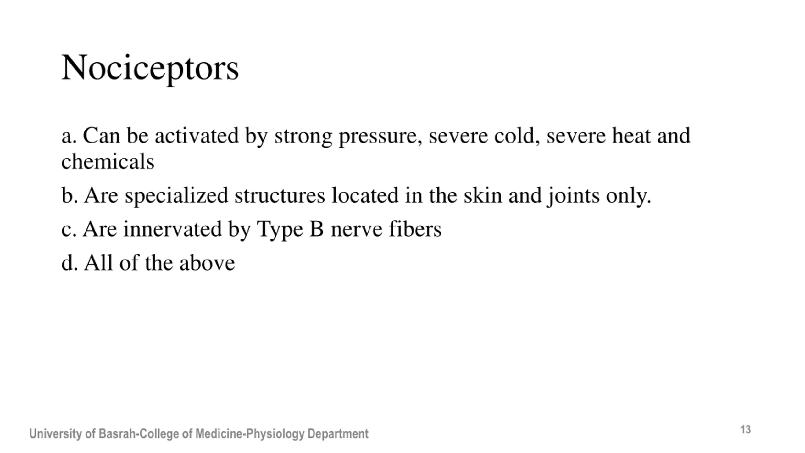 Nociceptors a. Can be activated by strong pressure, severe cold, severe heat and chemicals b. Are specialized structures located in the skin and joints only. c. Are innervated by Type B nerve fibers d. All of the above 13 University of Basrah-College of Medicine-Physiology Department