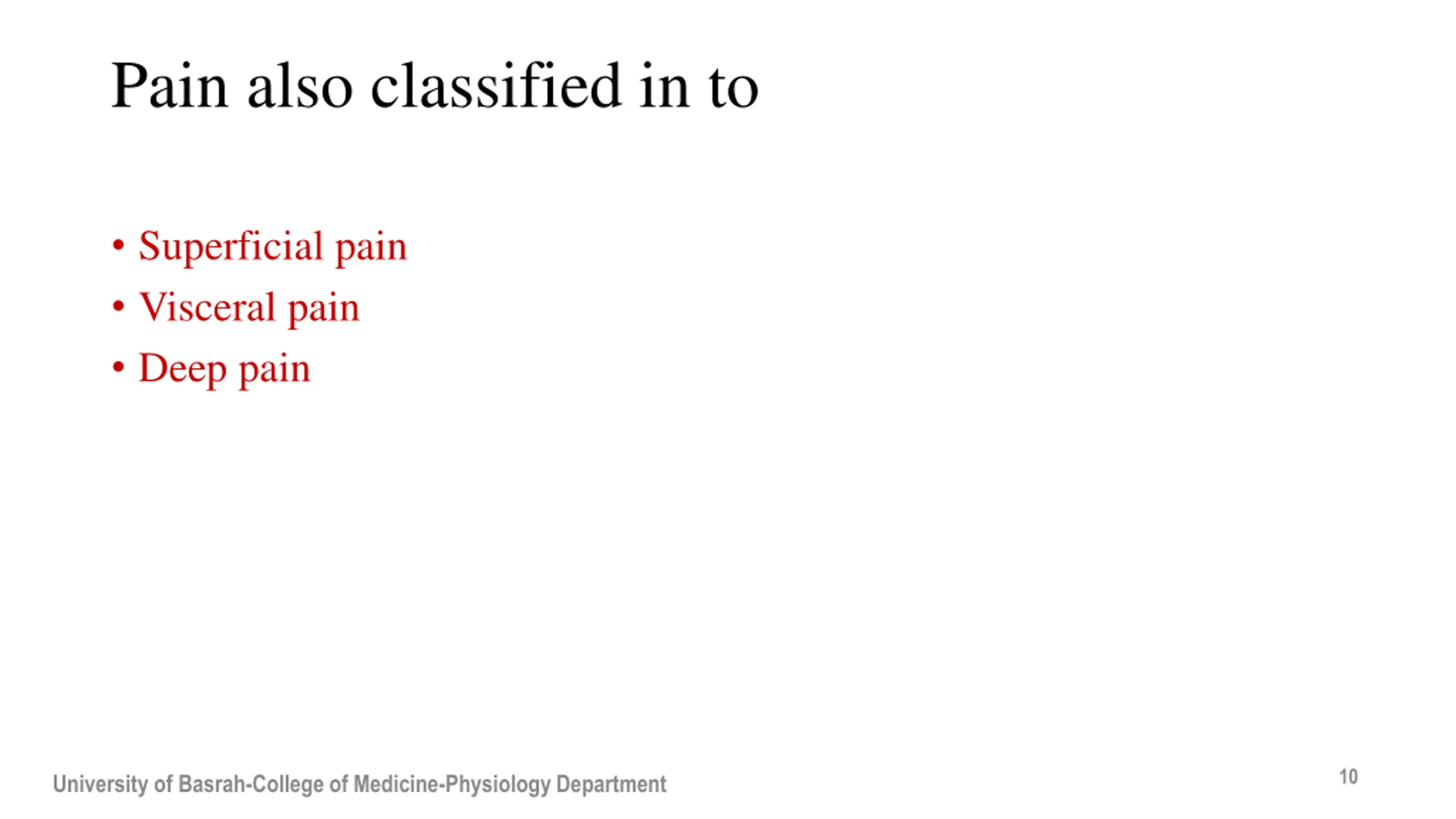Pain also classified in to Superficial pain Visceral pain Deep pain 10 University of Basrah-College of Medicine-Physiology Department