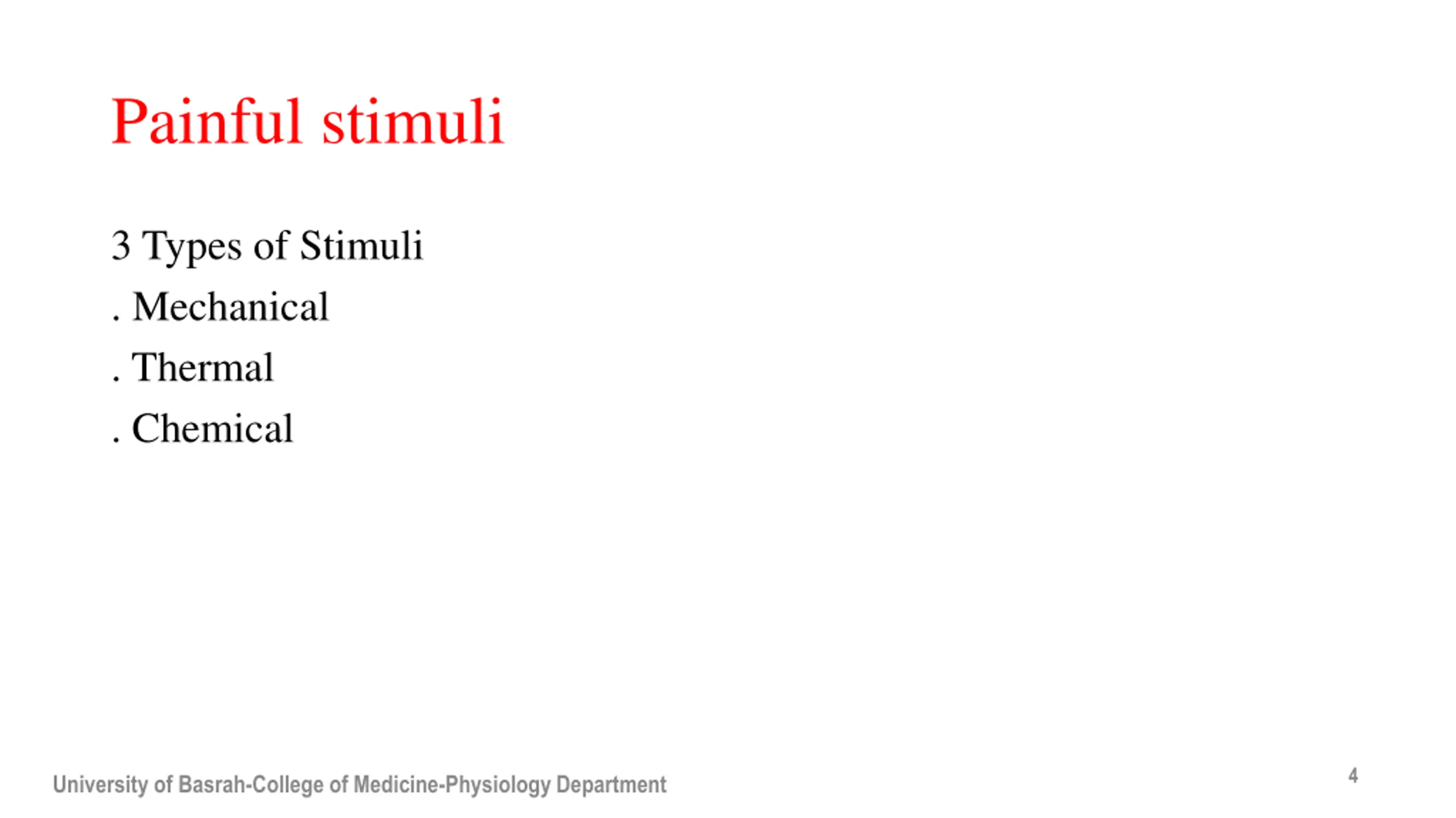 Painful stimuli 3 Types of Stimuli . Mechanical . Thermal . Chemical 4 University of Basrah-College of Medicine-Physiology Department