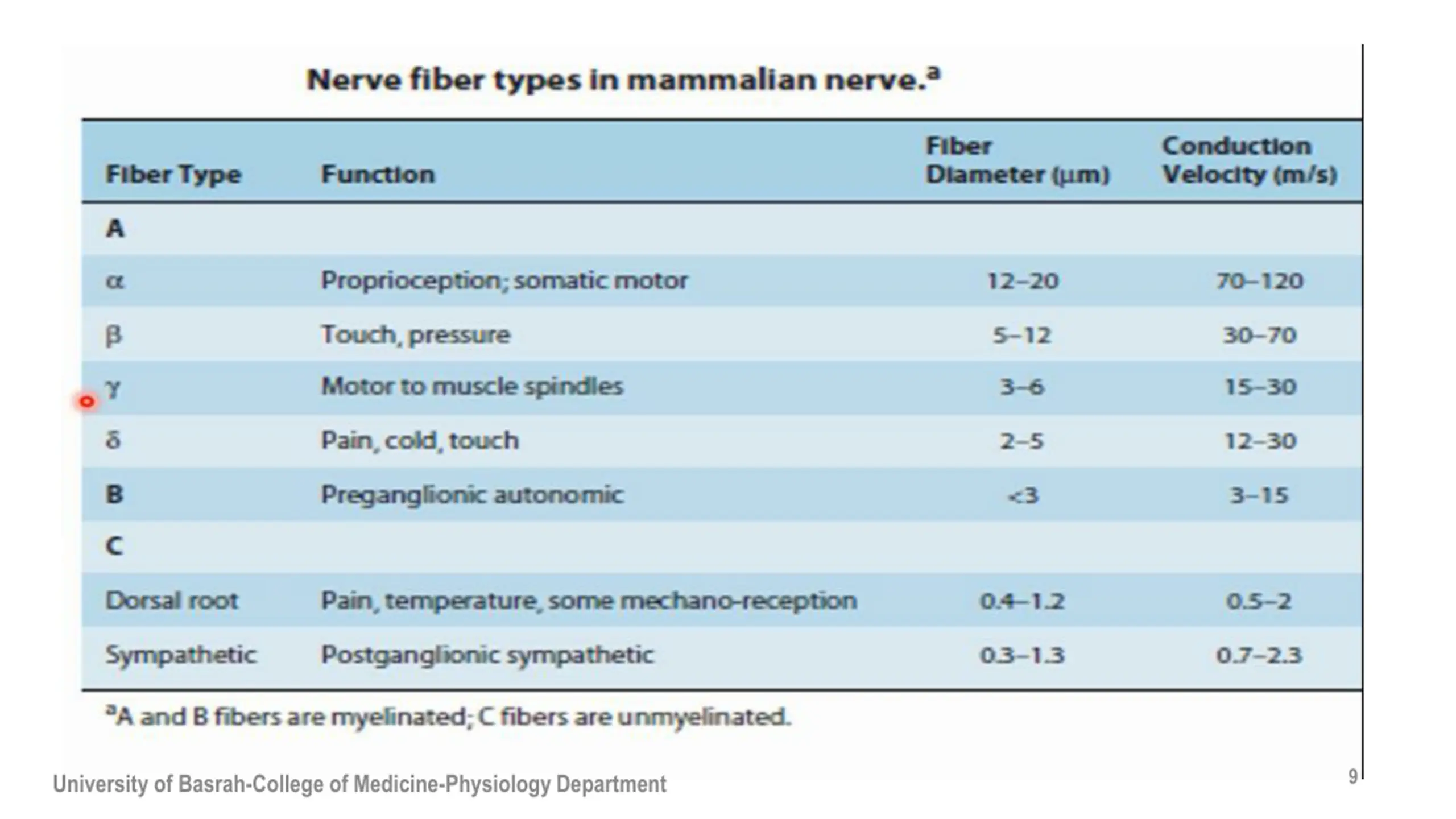 Fast pain Mechanical, thermal nociceptors Type A fibers Neurotransmitter: Glutamate. Slow pain Mechanical, thermal, chemical Type C fibers Neurotransmitter is : substance p 8 University of Basrah-College of Medicine-Physiology Department