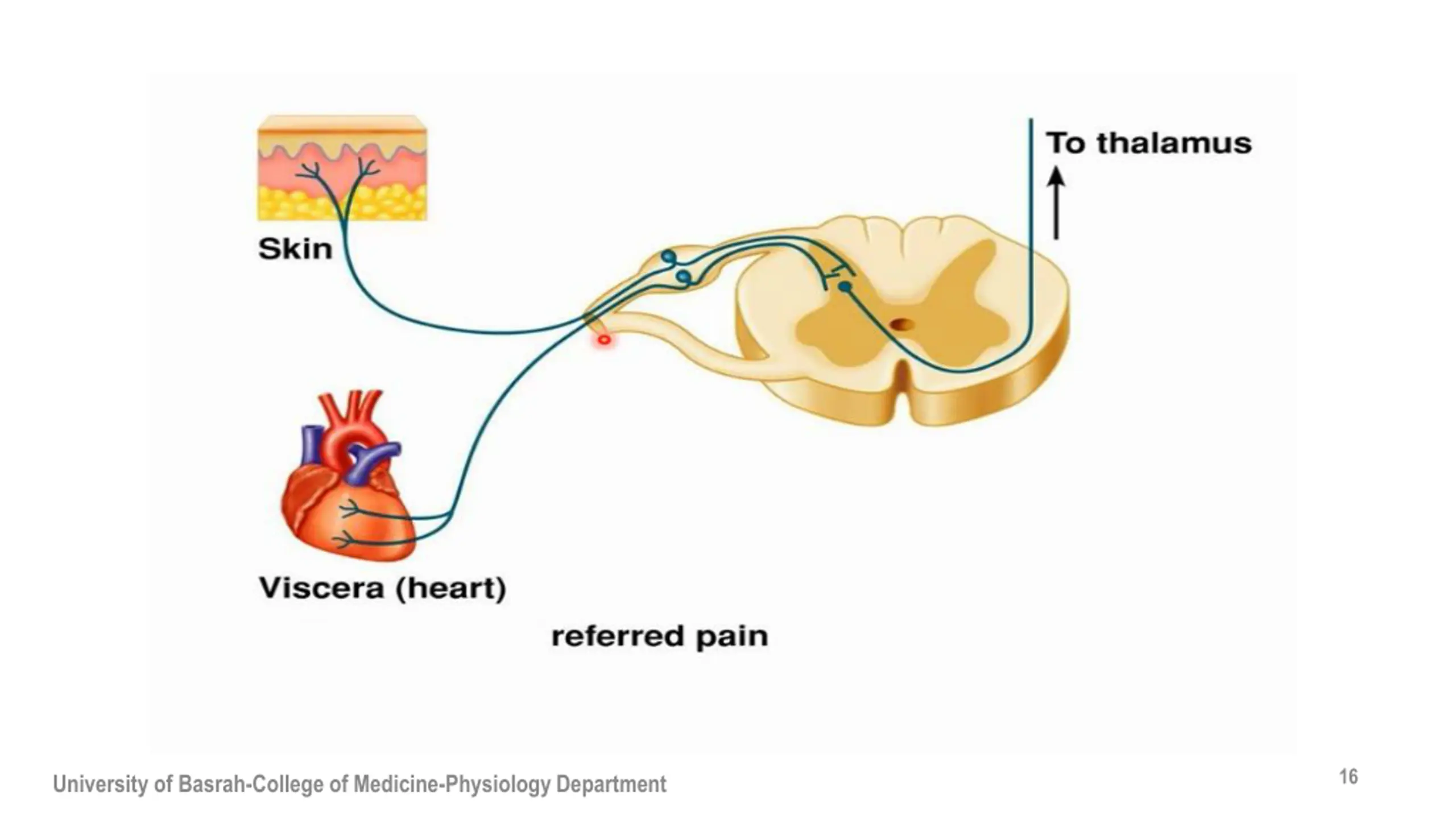 Mechanism of referred pain The Dermatomal rule: Pin is referred to structures that developed from the same embryonic segment or dermatome. Convergence_ projection theory: Convergence of somatic and visceral pain fibers on the same second order neurons. 15 University of Basrah-College of Medicine-Physiology Department