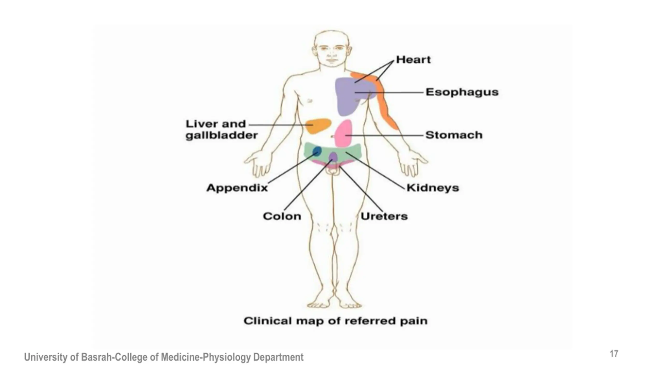 Referred pain A person feels pain in a part of the body that is fairly remote from the tissue. Best known examples: 1. Referred of cardiac pain to the inner aspect of the left arm 2. Pain in the tip of shoulder caused by irritation of the central portion of the diaphragm 14 University of Basrah-College of Medicine-Physiology Department