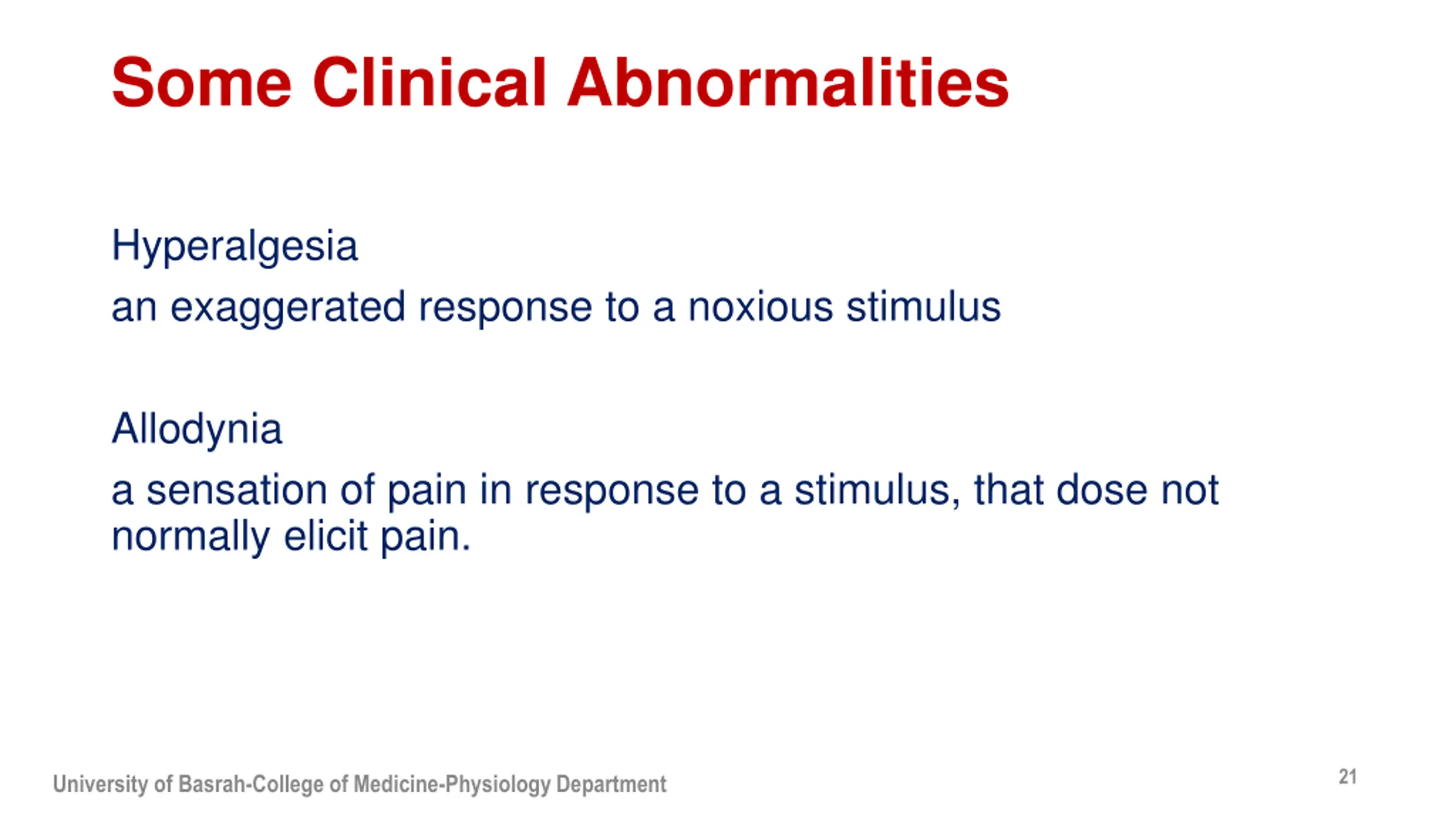 Some Clinical Abnormalities Hyperalgesia an exaggerated response to a noxious stimulus Allodynia a sensation of pain in response to a stimulus, that dose not normally elicit pain. 21 University of Basrah-College of Medicine-Physiology Department