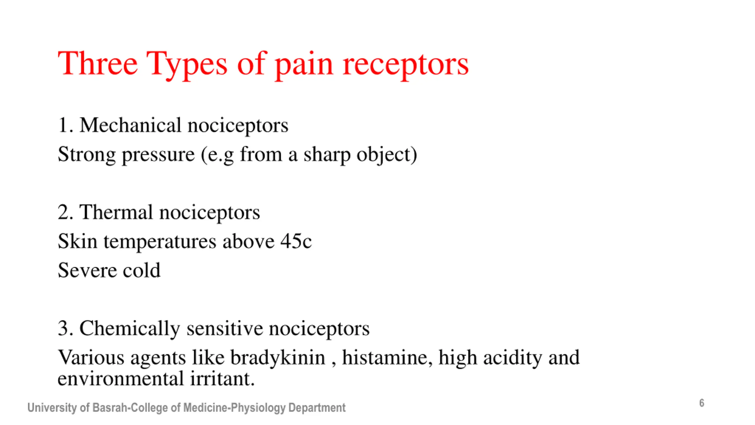 Three Types of pain receptors 1. Mechanical nociceptors Strong pressure (e.g from a sharp object) 2. Thermal nociceptors Skin temperatures above 45c Severe cold 3. Chemically sensitive nociceptors Various agents like bradykinin , histamine, high acidity and environmental irritant. 6 University of Basrah-College of Medicine-Physiology Department