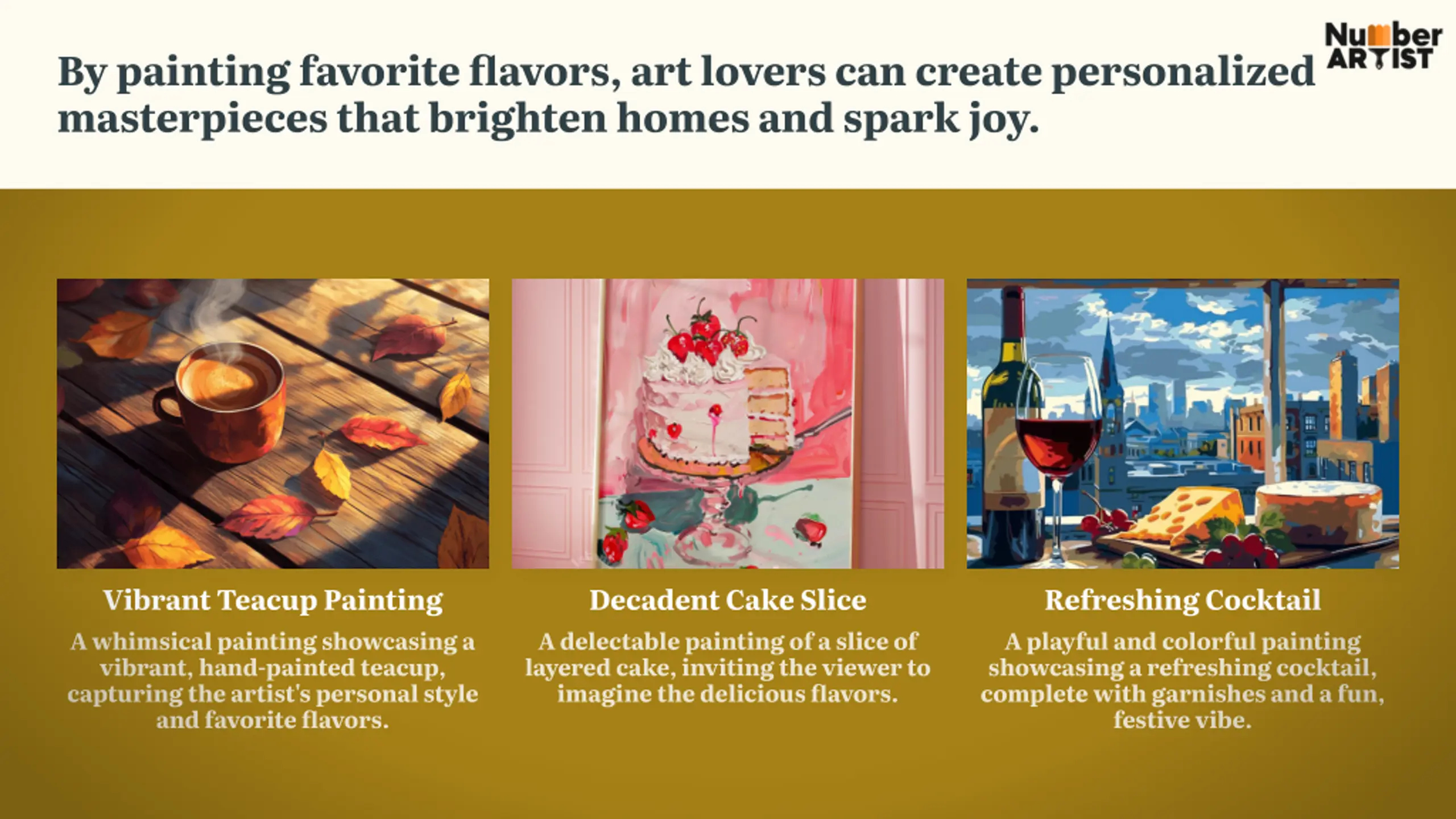By painting favorite flavors, art lovers can create personalized masterpieces that brighten homes and spark joy. Vibrant Teacup Painting Decadent Cake Slice Refreshing Cocktail A whimsical painting showcasing a vibrant, hand-painted teacup, capturing the artist's personal style and favorite flavors. A delectable painting of a slice of layered cake, inviting the viewer to imagine the delicious flavors. A playful and colorful painting showcasing a refreshing cocktail, complete with garnishes and a fun, festive vibe.