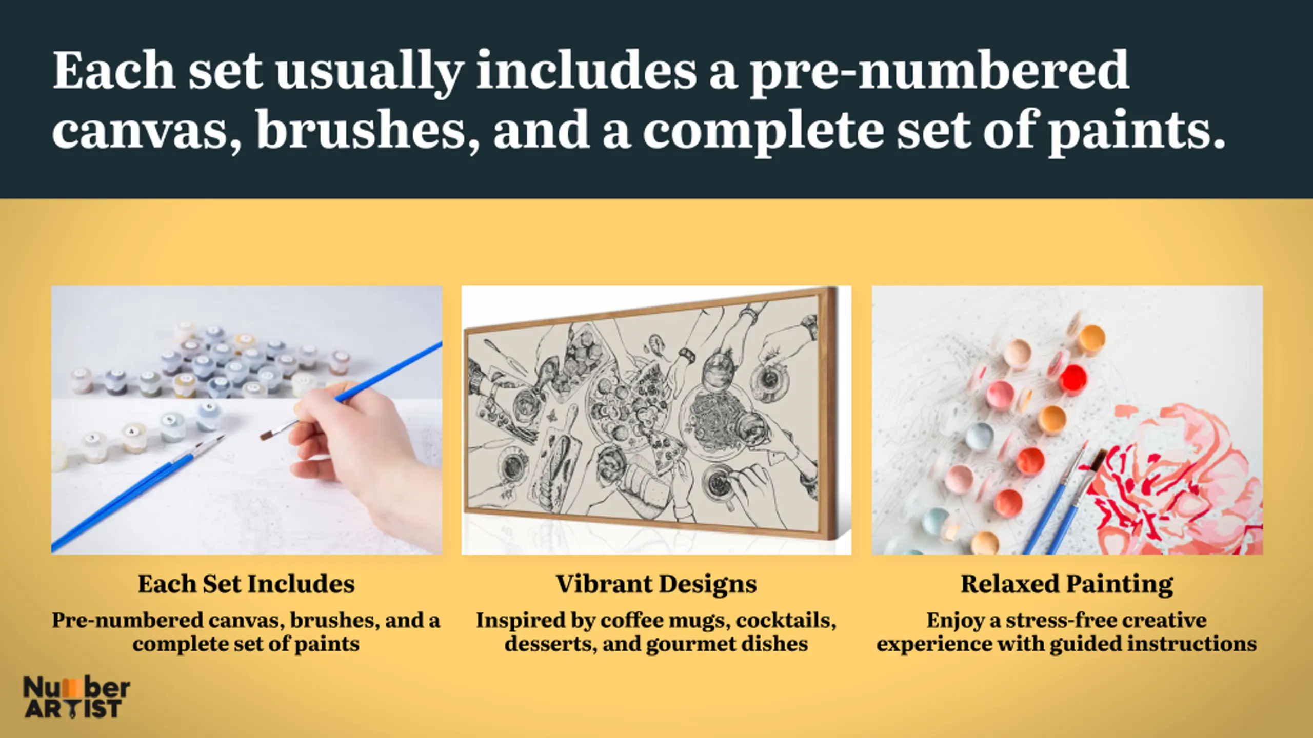 Each set usually includes a pre-numbered canvas, brushes, and a complete set of paints. Each Set Includes Vibrant Designs Relaxed Painting Pre-numbered canvas, brushes, and a complete set of paints Inspired by coffee mugs, cocktails, desserts, and gourmet dishes Enjoy a stress-free creative experience with guided instructions