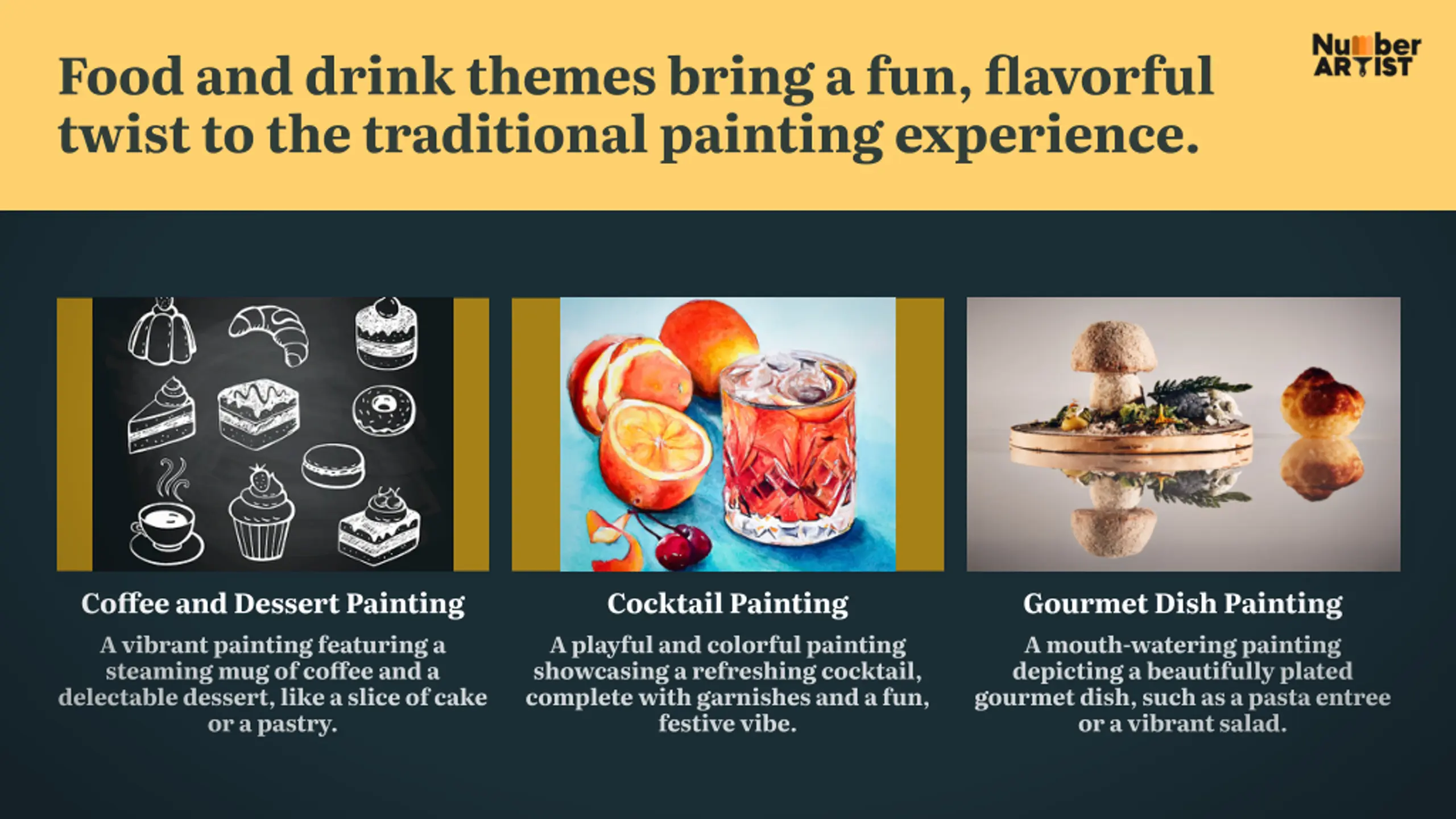Food and drink themes make thoughtful gifts for foodies, hobbyists, or anyone exploring new creative pastimes. Cocktail Painting Gourmet Dish Painting Visually Appetizing Dessert