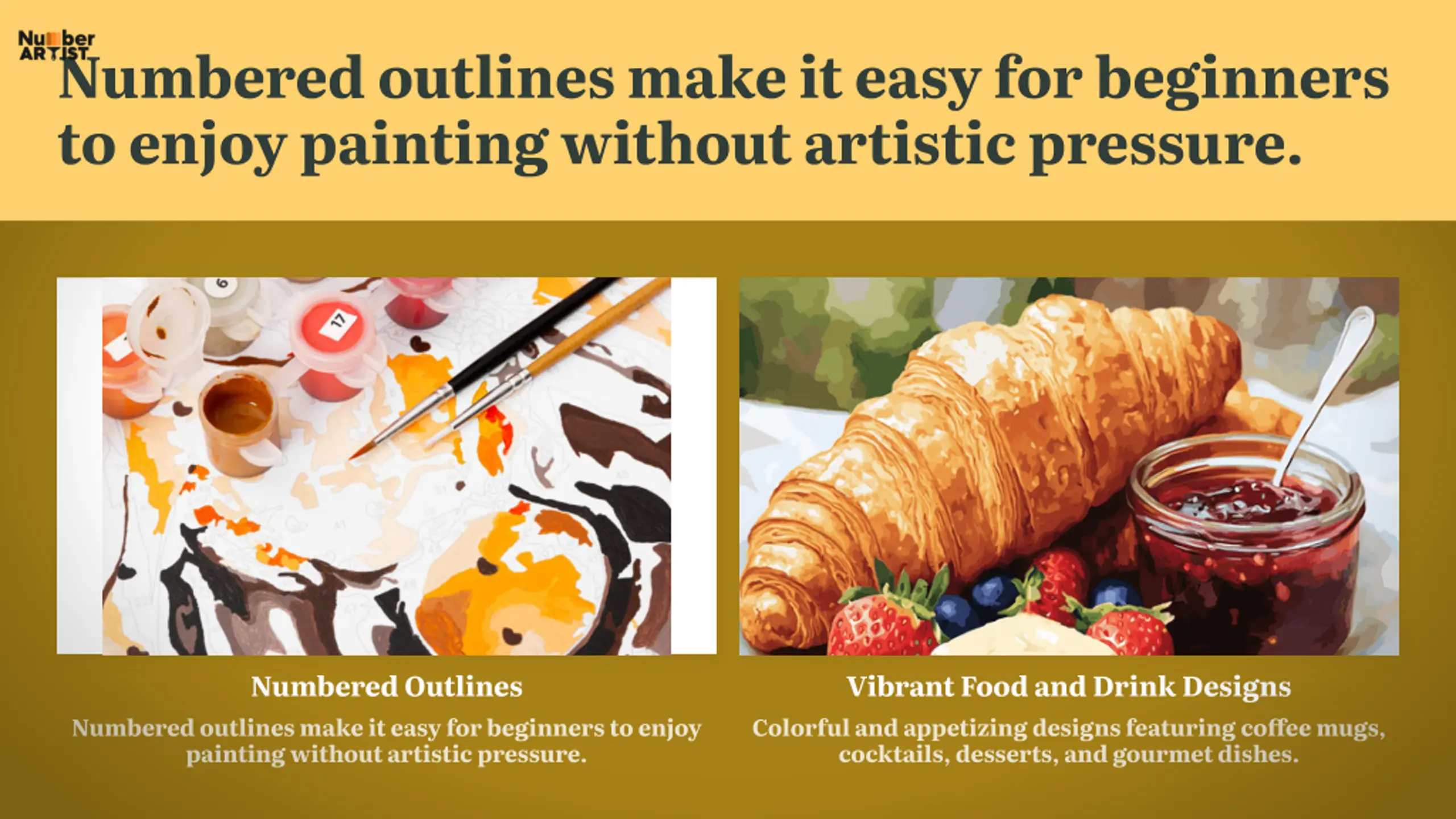 Paint by NumlPaint by number kits offer a relaxing way to combine creativity with structured guidance. Paint by Number Kit Relaxed Painting Vibrant Food and Drink Designs A paint by number kit with a pre- numbered canvas and brushes A person painting with a focused, relaxed expression Colorful and appetizing designs featuring coffee mugs, cocktails, desserts, and gourmet dishes