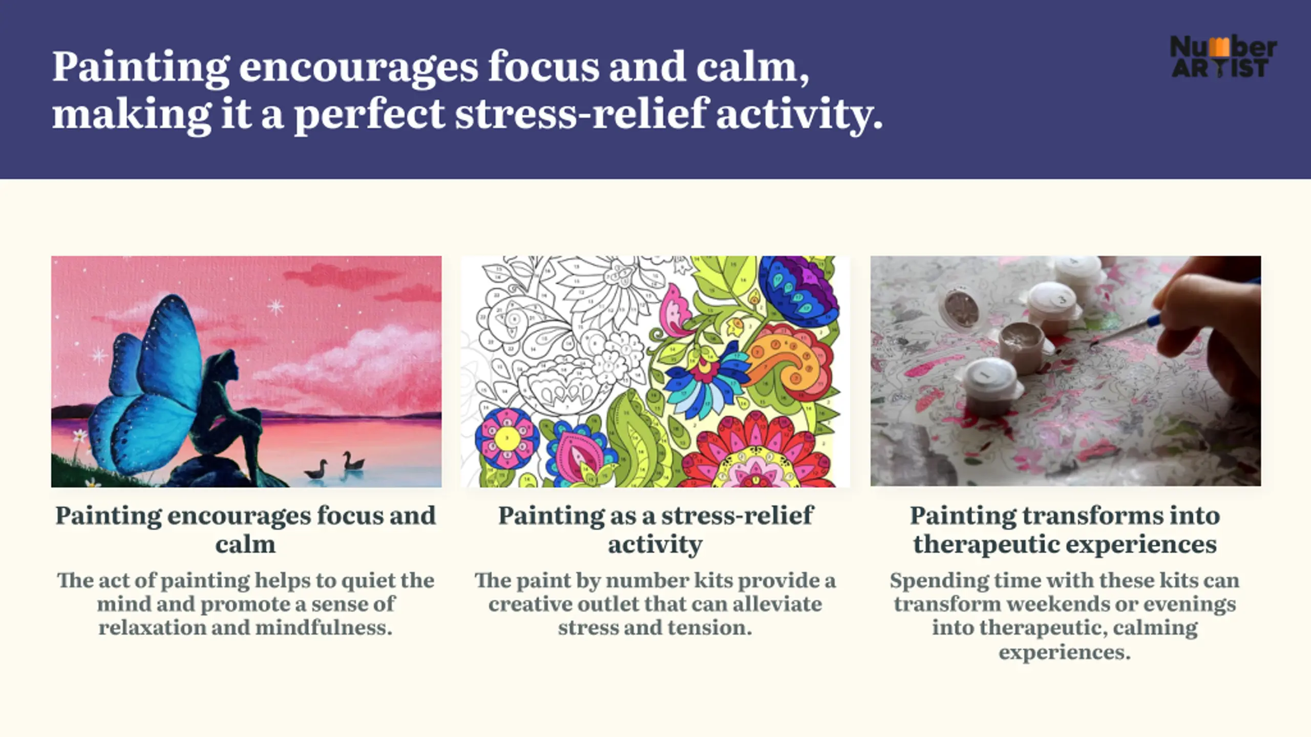 Painting encourages focus and calm, making it a perfect stress-relief activity. Painting encourages focus and calm Painting as a stress-relief activity Painting transforms into therapeutic experiences ?e act of painting helps to quiet the mind and promote a sense of relaxation and mindfulness. ?e paint by number kits provide a creative outlet that can alleviate stress and tension. Spending time with these kits can transform weekends or evenings into therapeutic, calming experiences.