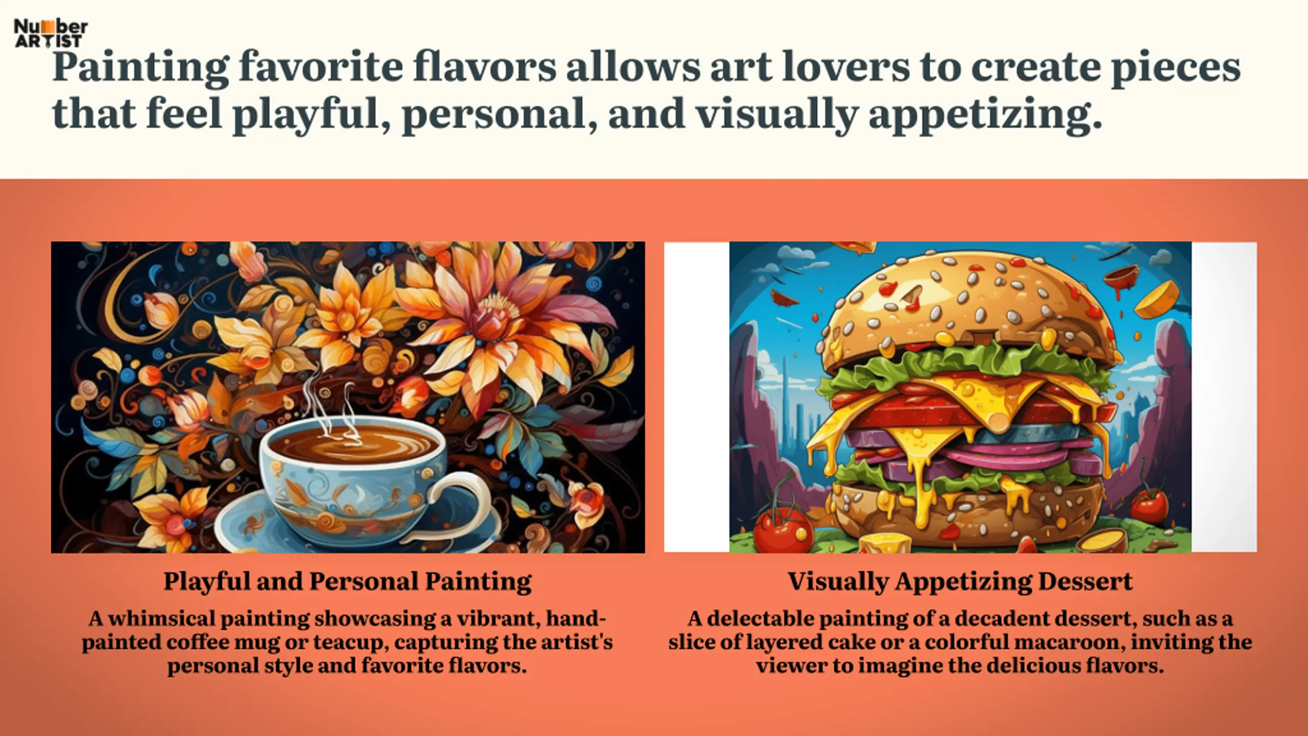 Painting favorite flavors allows art lovers to create pieces that feel playful, personal, and visually appetizing. Playful and Personal Painting Visually Appetizing Dessert A whimsical painting showcasing a vibrant, hand- painted coffee mug or teacup, capturing the artist's personal style and favorite flavors. A delectable painting of a decadent dessert, such as a slice of layered cake or a colorful macaroon, inviting the viewer to imagine the delicious flavors.