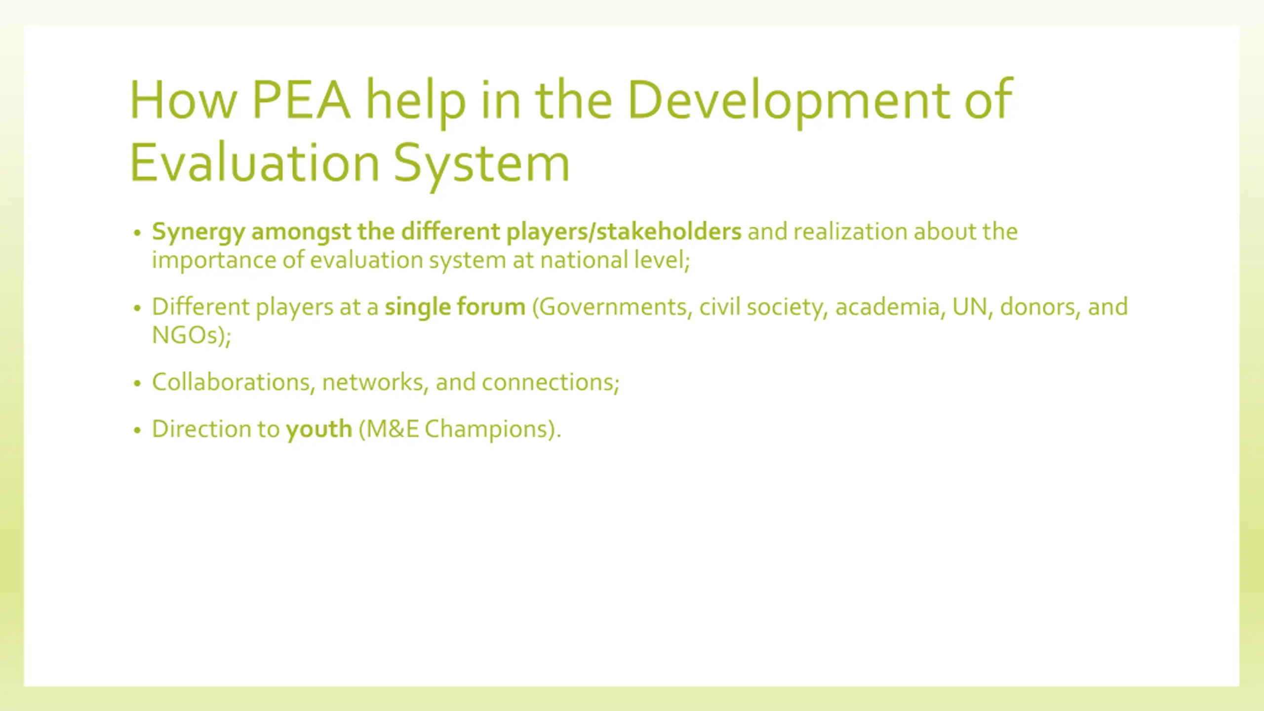How PEA help in the Development of Evaluation System Synergy amongst the different players/stakeholders and realization about the importance of evaluation system at national level; Different players at a single forum (Governments, civil society, academia, UN, donors, and NGOs); Collaborations, networks, and connections; Direction to youth (M&E Champions).