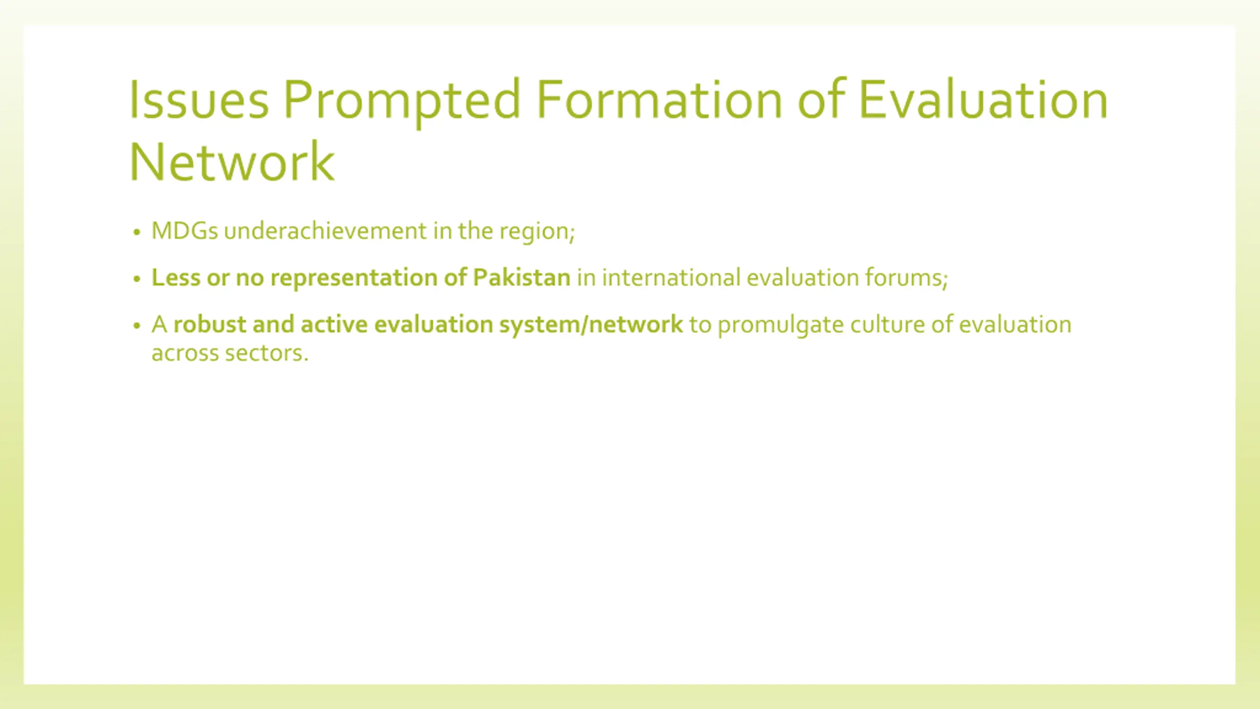 Issues Prompted Formation of Evaluation Network MDGs underachievement in the region; Less or no representation of Pakistan in international evaluation forums; A robust and active evaluation system/network to promulgate culture of evaluation across sectors.