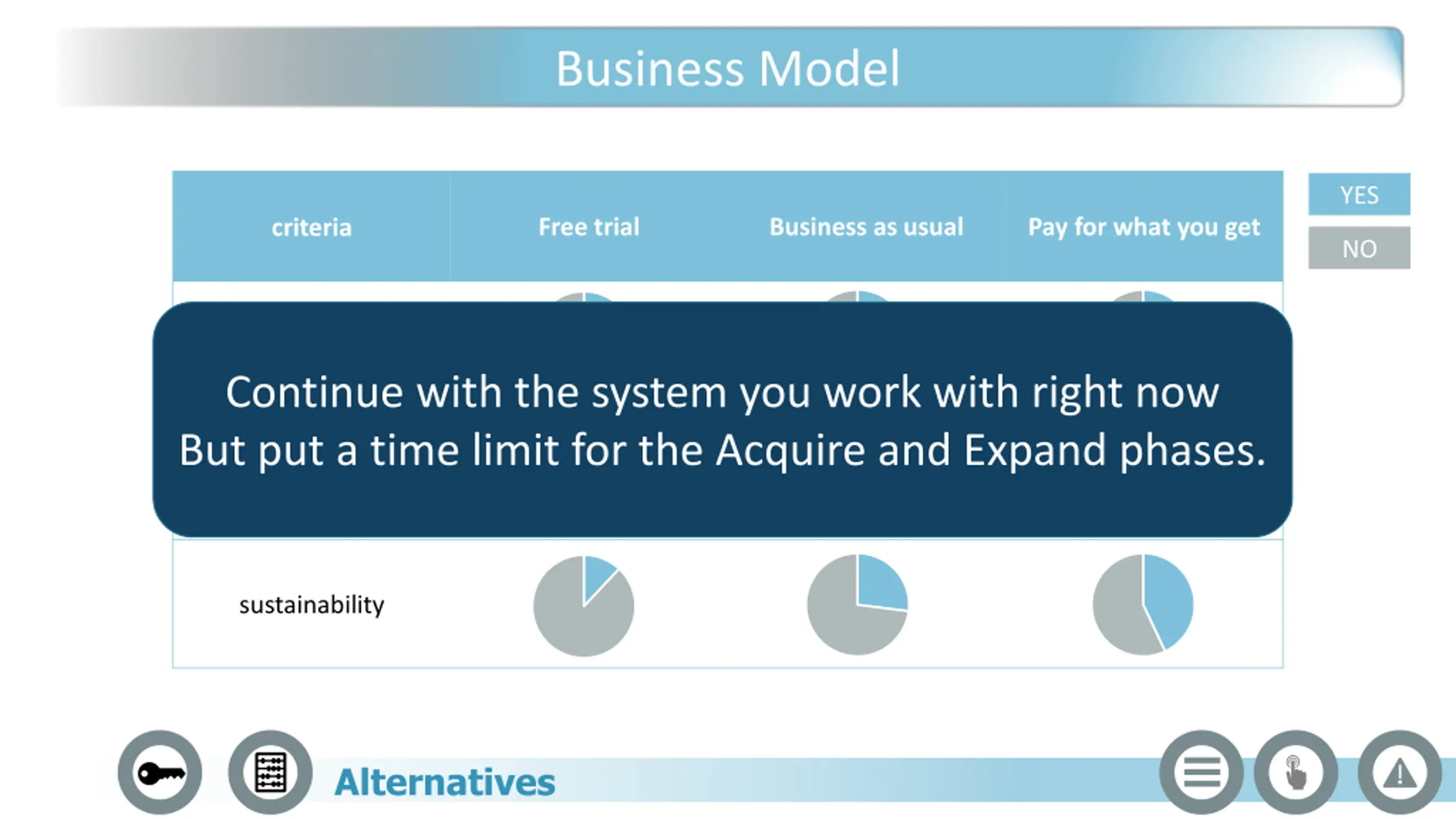 Business Model YES Free trial Business as usual Pay for what you get criteria NO Investment Required Continue with the system you work with right now But put a time limit for the Acquire and Expand phases. Revenue sustainability Alternatives