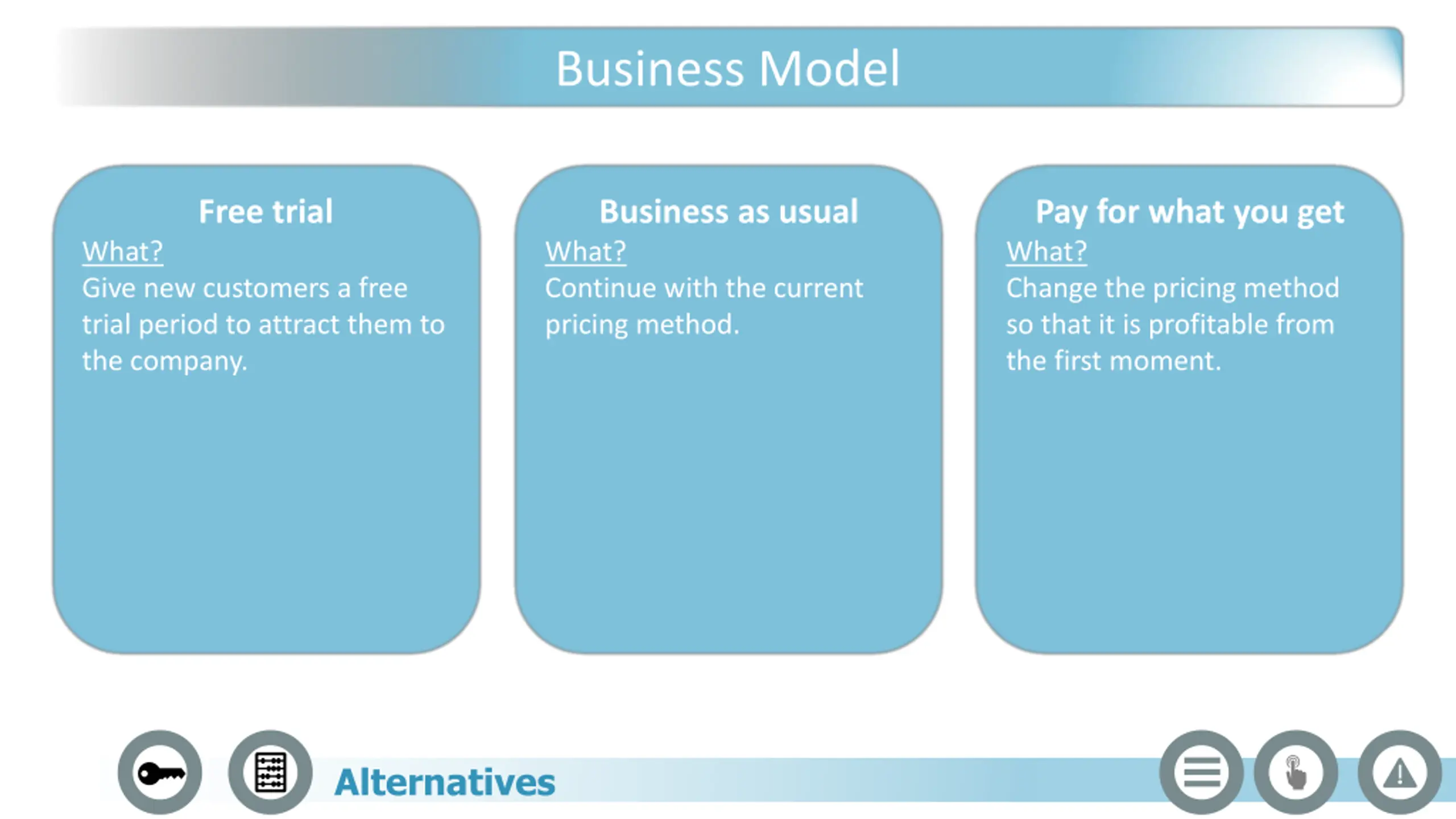 Business Model Free trial Business as usual What? Continue with the current pricing method. Pay for what you get What? Change the pricing method so that it is profitable from the first moment. What? Give new customers a free trial period to attract them to the company. Alternatives