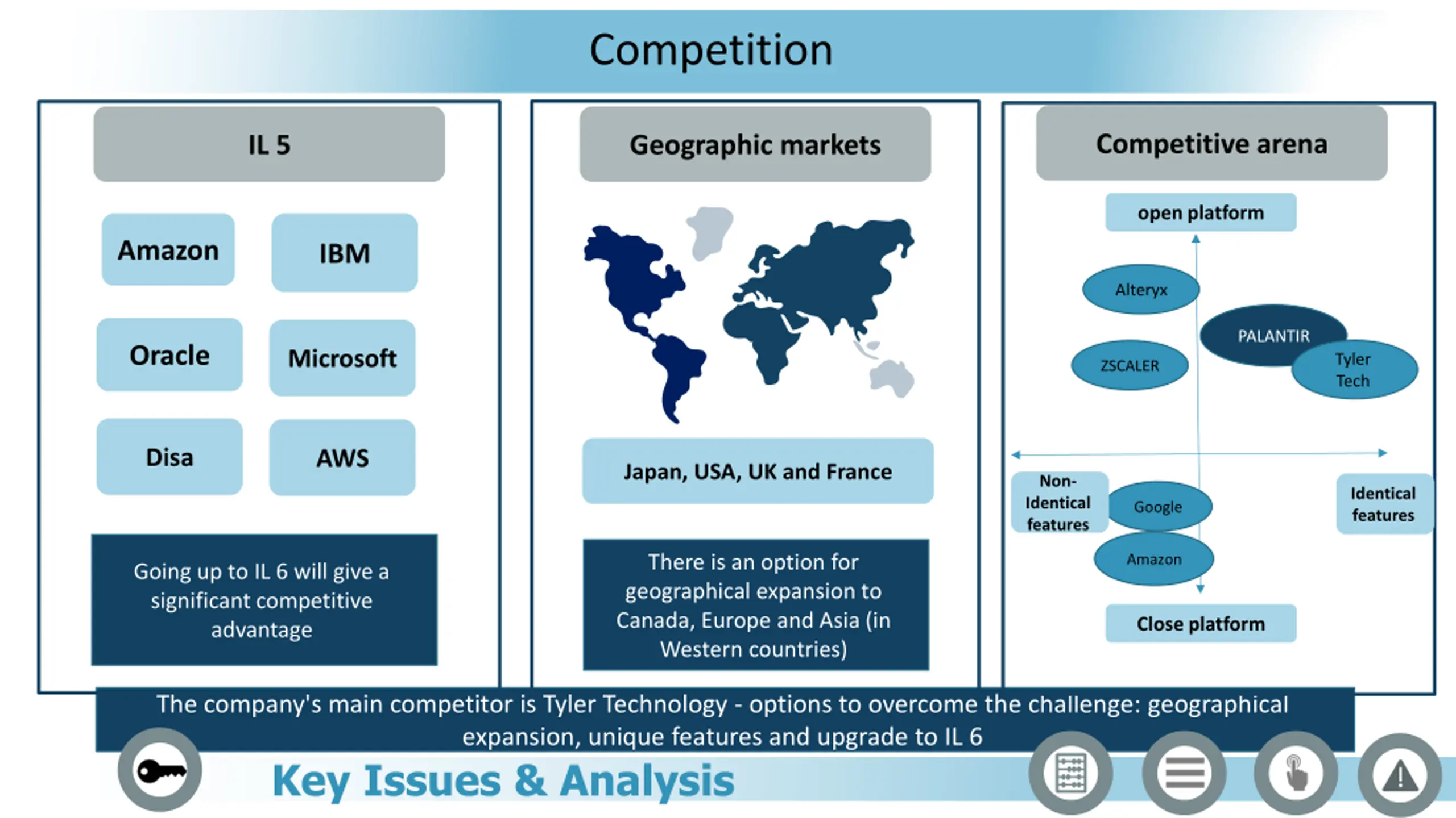 Competition Competitive arena IL 5 Geographic markets open platform Amazon IBM Alteryx PALANTIR Oracle Microsoft Tyler Tech ZSCALER Disa AWS Japan, USA, UK and France Non- Identical features Identical features Google There is an option for geographical expansion to Canada, Europe and Asia (in Western countries) Amazon Going up to IL 6 will give a significant competitive advantage Close platform The company's main competitor is Tyler Technology - options to overcome the challenge: geographical expansion, unique features and upgrade to IL 6 Key Issues & Analysis
