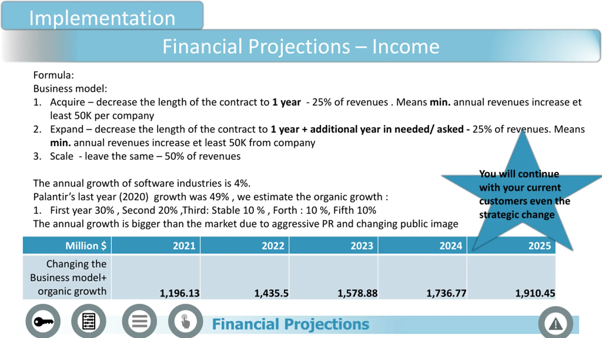 Implementation Financial Projections Income Formula: Business model: 1. Acquire decrease the length of the contract to 1 year - 25% of revenues . Means min. annual revenues increase et least 50K per company 2. Expand decrease the length of the contract to 1 year + additional year in needed/ asked - 25% of revenues. Means min. annual revenues increase et least 50K from company 3. Scale - leave the same 50% of revenues You will continue with your current customers even the strategic change The annual growth of software industries is 4%. Palantir s last year (2020) growth was 49% , we estimate the organic growth : 1. First year 30% , Second 20% ,Third: Stable 10 % , Forth : 10 %, Fifth 10% The annual growth is bigger than the market due to aggressive PR and changing public image Million $ 2021 2022 2023 2024 2025 Changing the Business model+ organic growth 1,196.13 1,435.5 1,578.88 1,736.77 1,910.45 Financial Projections