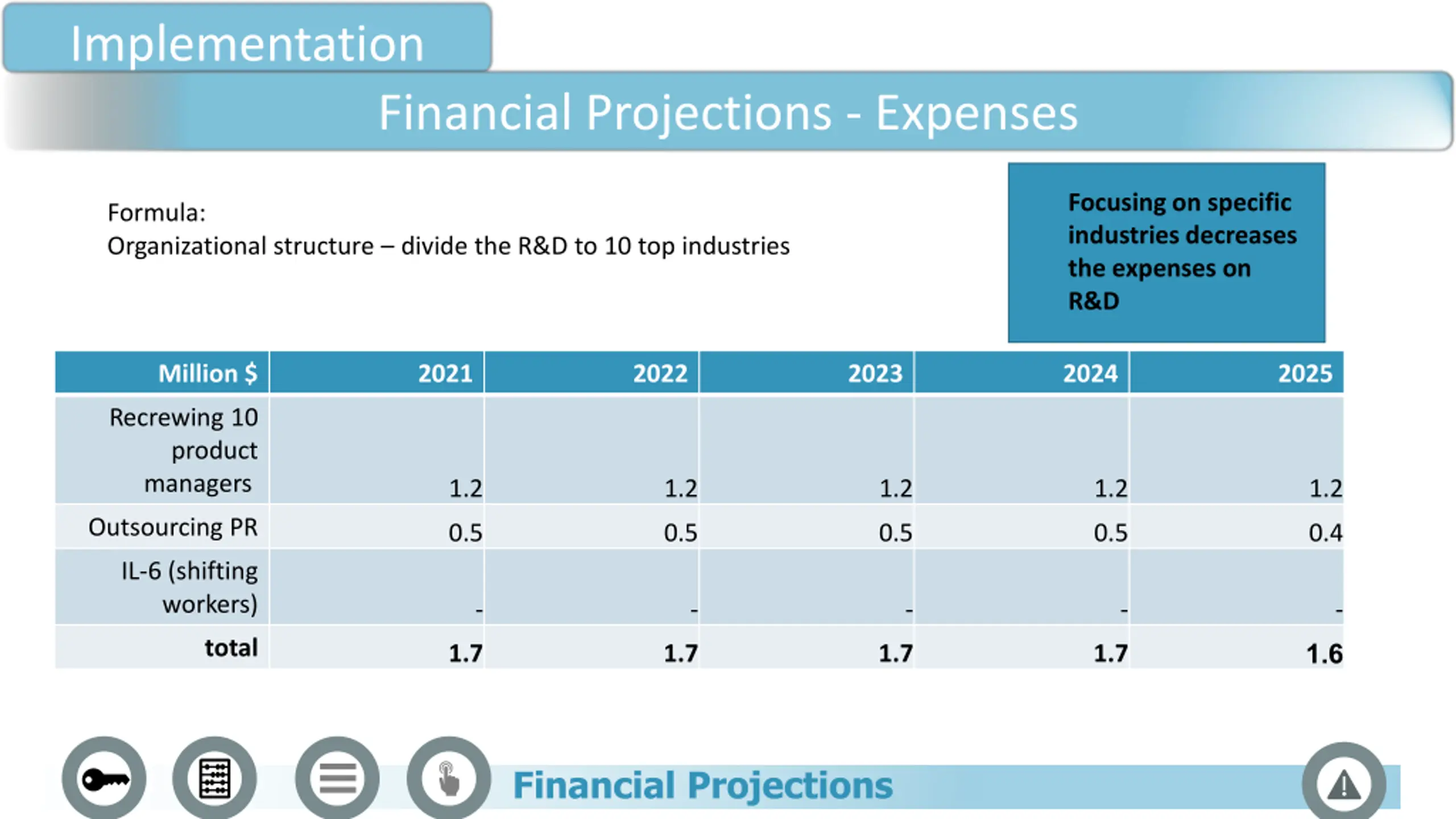 Implementation Financial Projections - Expenses Focusing on specific industries decreases the expenses on R&D Formula: Organizational structure divide the R&D to 10 top industries Million $ 2021 2022 2023 2024 2025 Recrewing 10 product managers 1.2 1.2 1.2 1.2 1.2 Outsourcing PR 0.5 0.5 0.5 0.5 0.4 IL-6 (shifting workers) - - - - - total 1.6 1.7 1.7 1.7 1.7 Financial Projections