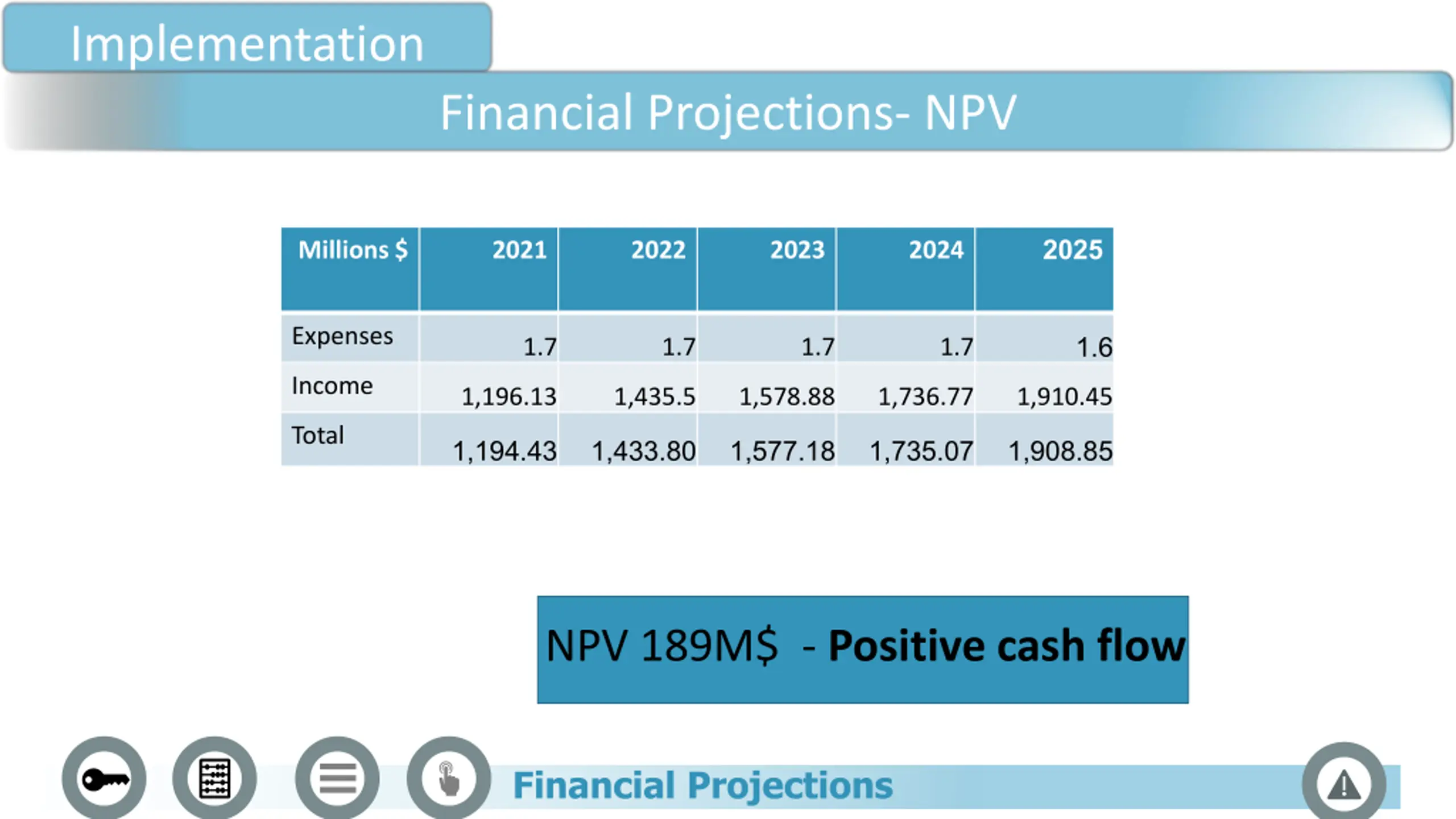 Implementation Financial Projections- NPV 2025 Millions $ 2021 2022 2023 2024 Expenses 1.6 1.7 1.7 1.7 1.7 Income 1,196.13 1,435.5 1,578.88 1,736.77 1,910.45 Total 1,194.43 1,433.80 1,577.18 1,735.07 1,908.85 NPV 189M$ - Positive cash flow Financial Projections