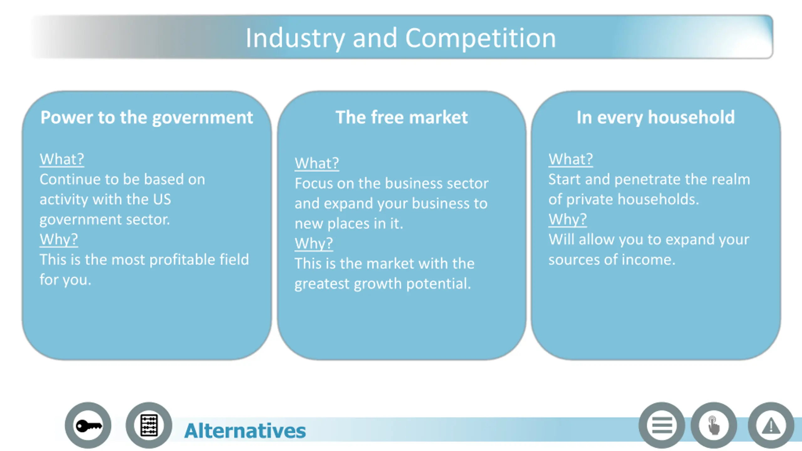 Industry and Competition Power to the government The free market In every household What? Continue to be based on activity with the US government sector. Why? This is the most profitable field for you. What? Start and penetrate the realm of private households. Why? Will allow you to expand your sources of income. What? Focus on the business sector and expand your business to new places in it. Why? This is the market with the greatest growth potential. Alternatives