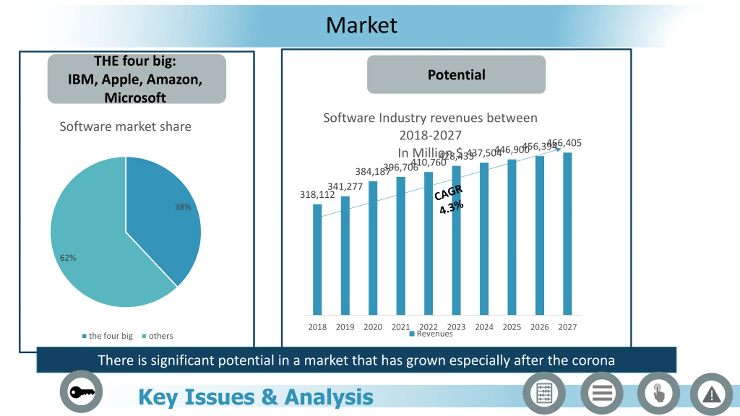 Market THE four big: IBM, Apple, Amazon, Microsoft Potential Software Industry revenues between 2018-2027 Software market share 466,405 428,433437,504446,900456,394 In Million $ 384,187396,706410,760 341,277 318,112 38% 62% 2018 2019 2020 2021 2022 Revenues 2023 2024 2025 2026 2027 the four big others There is significant potential in a market that has grown especially after the corona Key Issues & Analysis