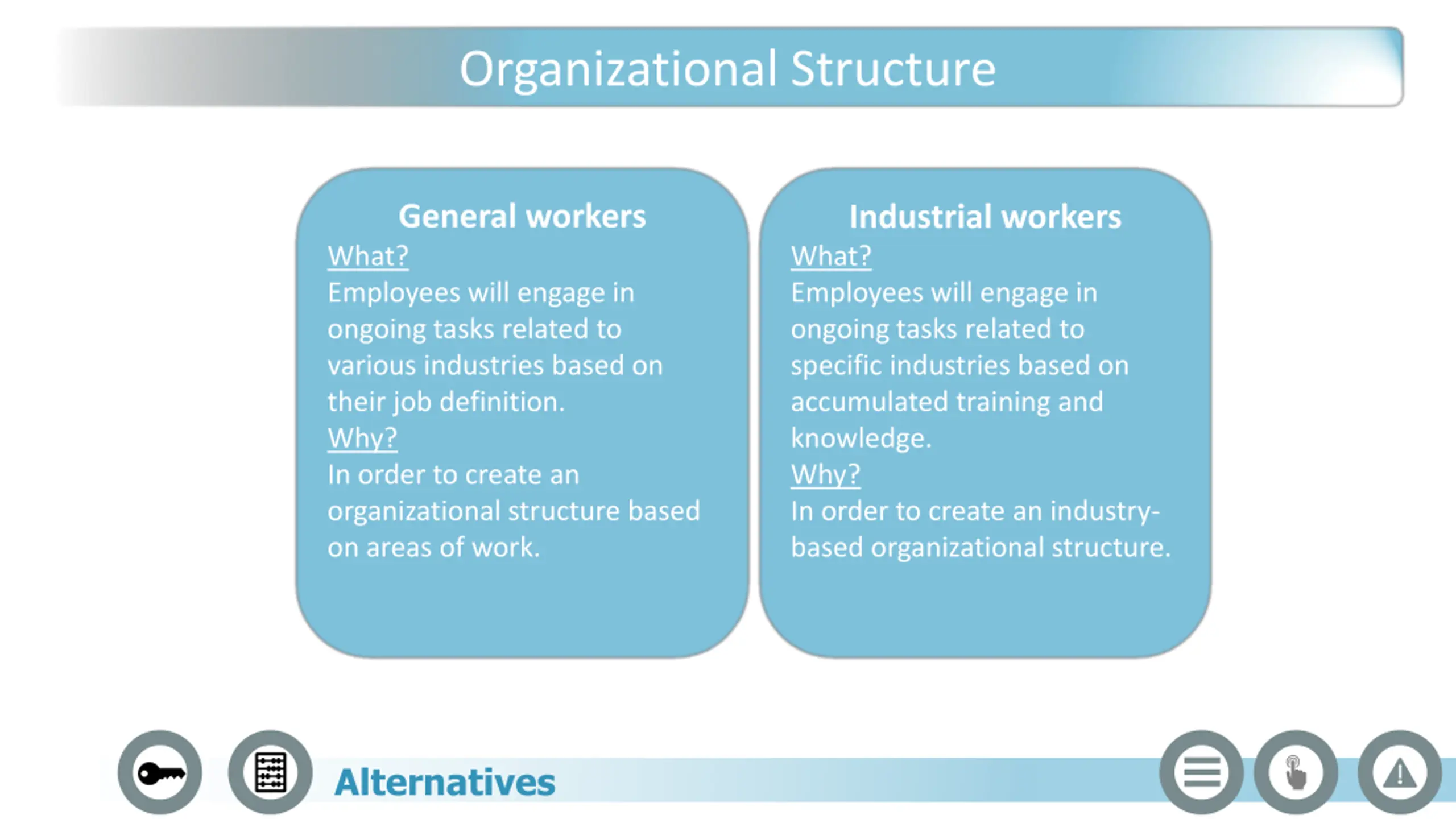Organizational Structure General workers What? Employees will engage in ongoing tasks related to various industries based on their job definition. Why? In order to create an organizational structure based on areas of work. Industrial workers What? Employees will engage in ongoing tasks related to specific industries based on accumulated training and knowledge. Why? In order to create an industry- based organizational structure. Alternatives