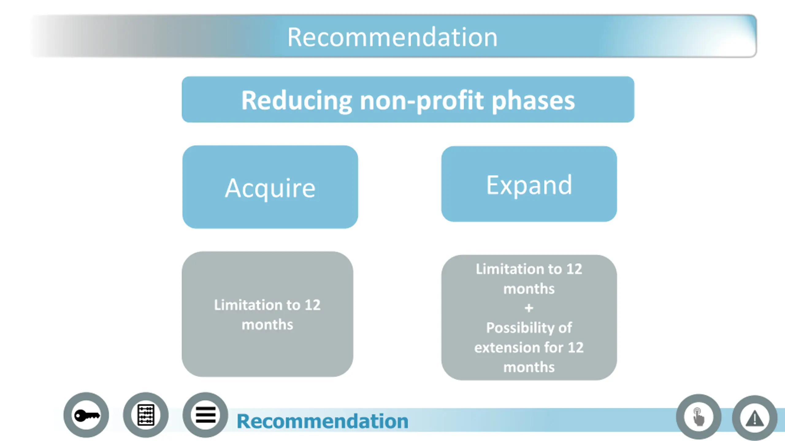Recommendation Reducing non-profit phases Expand Acquire Limitation to 12 months + Possibility of extension for 12 months Limitation to 12 months Recommendation