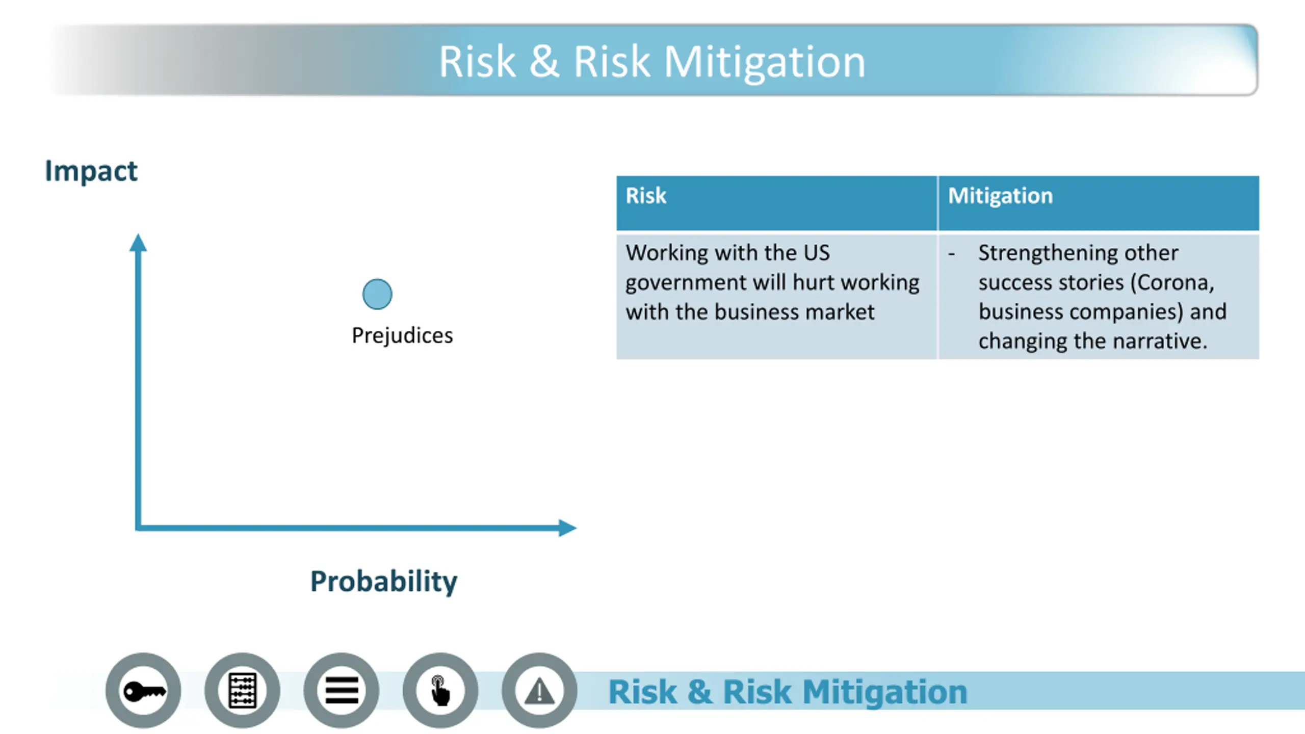 Risk & Risk Mitigation Impact Risk Mitigation Working with the US government will hurt working with the business market - Strengthening other success stories (Corona, business companies) and changing the narrative. Prejudices Probability Risk & Risk Mitigation